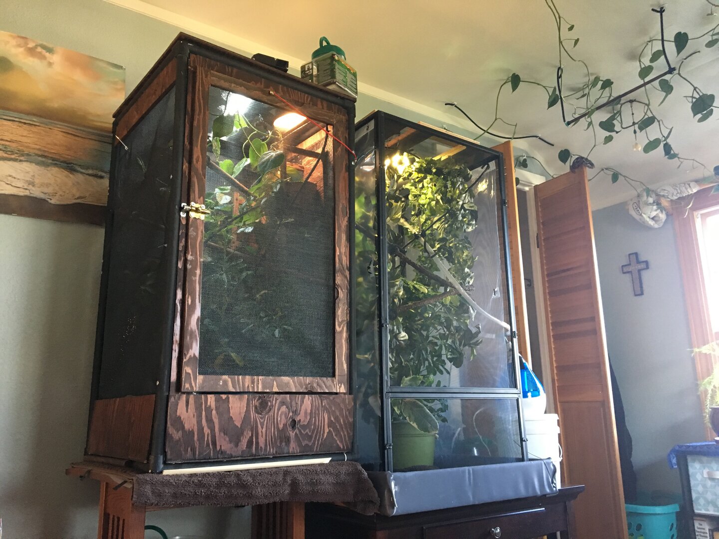 The girl... Flo.... easy peasey.... the boy, Nelix..... nothing, and I mean nothing .... distracts him from his misery of being confined! . He has ; indoor Viv , with every trimming, from monsoon to basking to cool spots. He has a window, with heat and light, and a good view of outside things... which amused him for about a week...he has outdoor parrot cage with stumps and vines ... and real UV ... no breezes .... and this darling, sweet divine little brat......