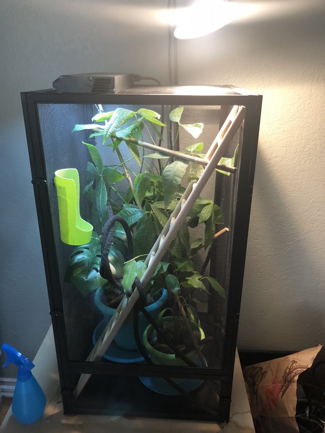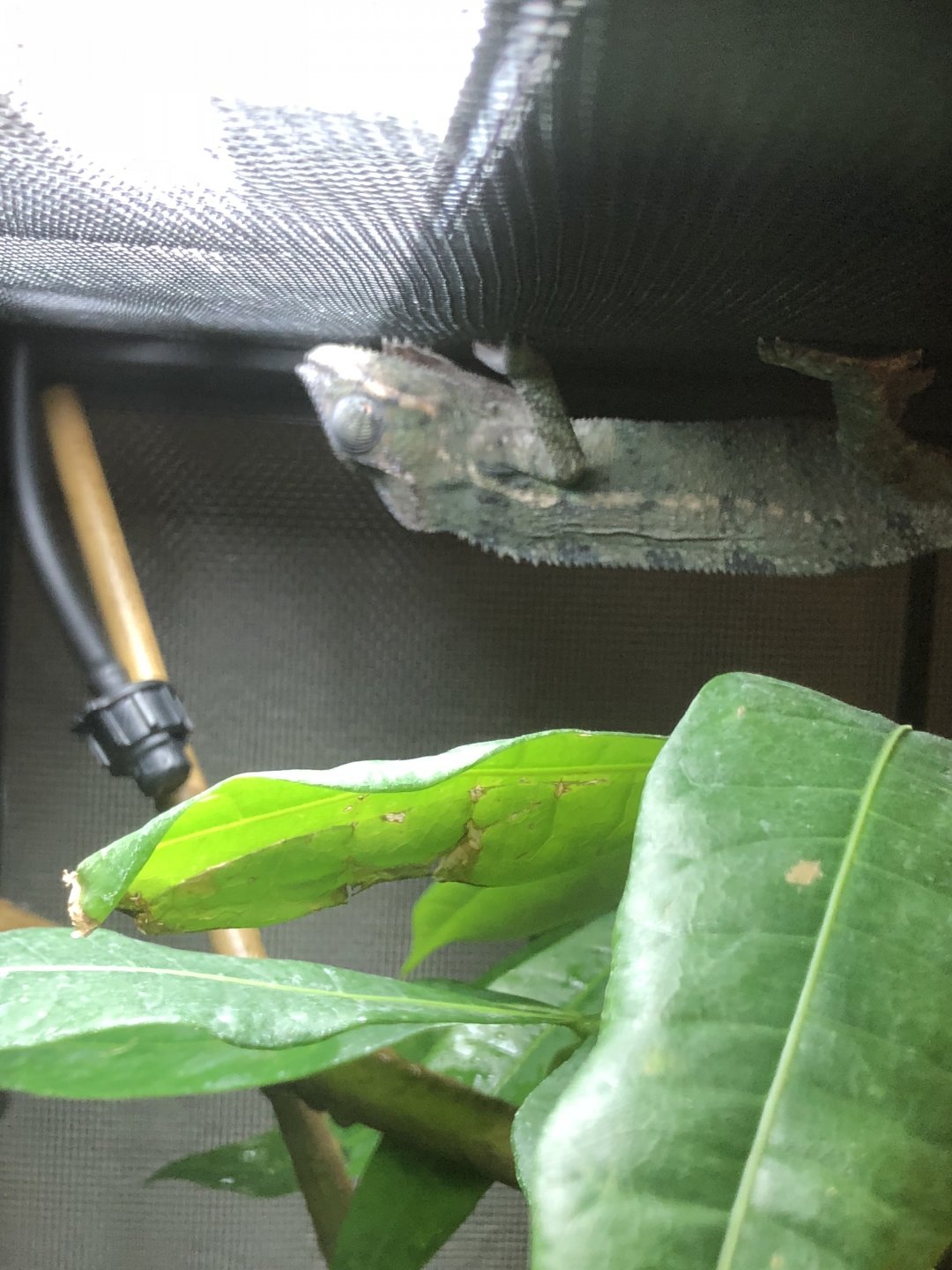 We were told to start with a smaller cage and move him to a bigger one as he grows. (To avoid falling too far) We have the bigger one, but I'm afraid to switch things up right now. But also worried that he's looking for more height. He spends so much time upside down on the ceiling. A vendor at a recent Repticon show said that was his way of trying to get warm. But he spends a lot of time under his UVB and it isn't warm.
