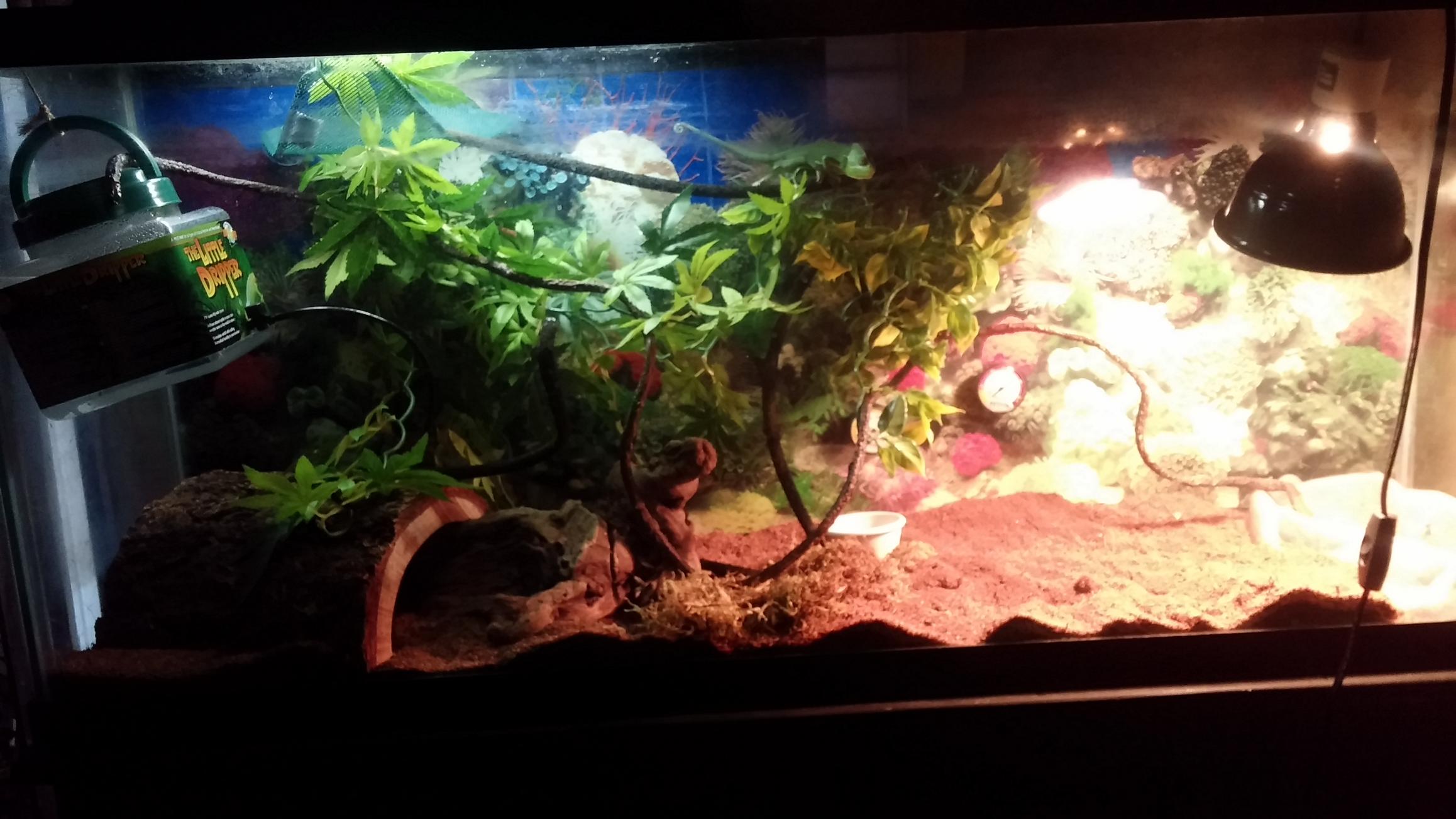 Was originally a setup for a tegu that fell through on me but have feeding down. Humidity is around 50 and generally mist twice a day. Putting mesh and a fan on top and the lights are correct. Might just upgrade to an actual terrarium