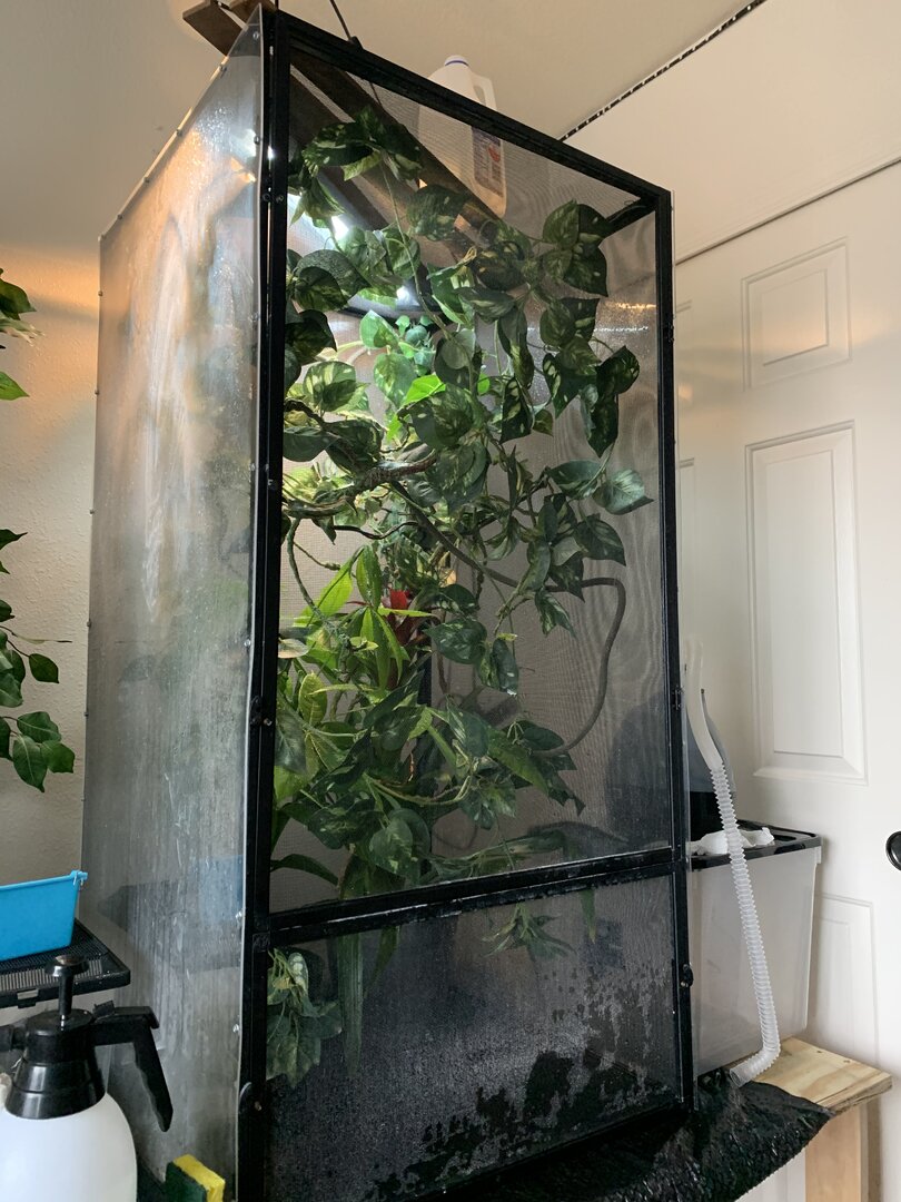 Humidity - This has been the hardest for us to get right. He has two large (cham safe) plants in his cage. Working on getting a few more. Frequent mistings to keep up humidity. Covered half of top of screen to help keep my humidifier fog flowing down, just did this yesterday, but fogger is no longer working. Humidity gauge just stopped working so again I am buying a new one
