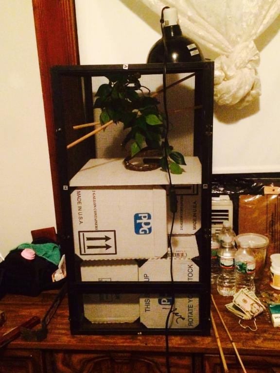 For a cham that young, ur going to need lots of tiny bugs. With all that cardboard , there is endless places for bugs to hide. That'll get expensive real quick. Probably better to just throw a live plant in there for height