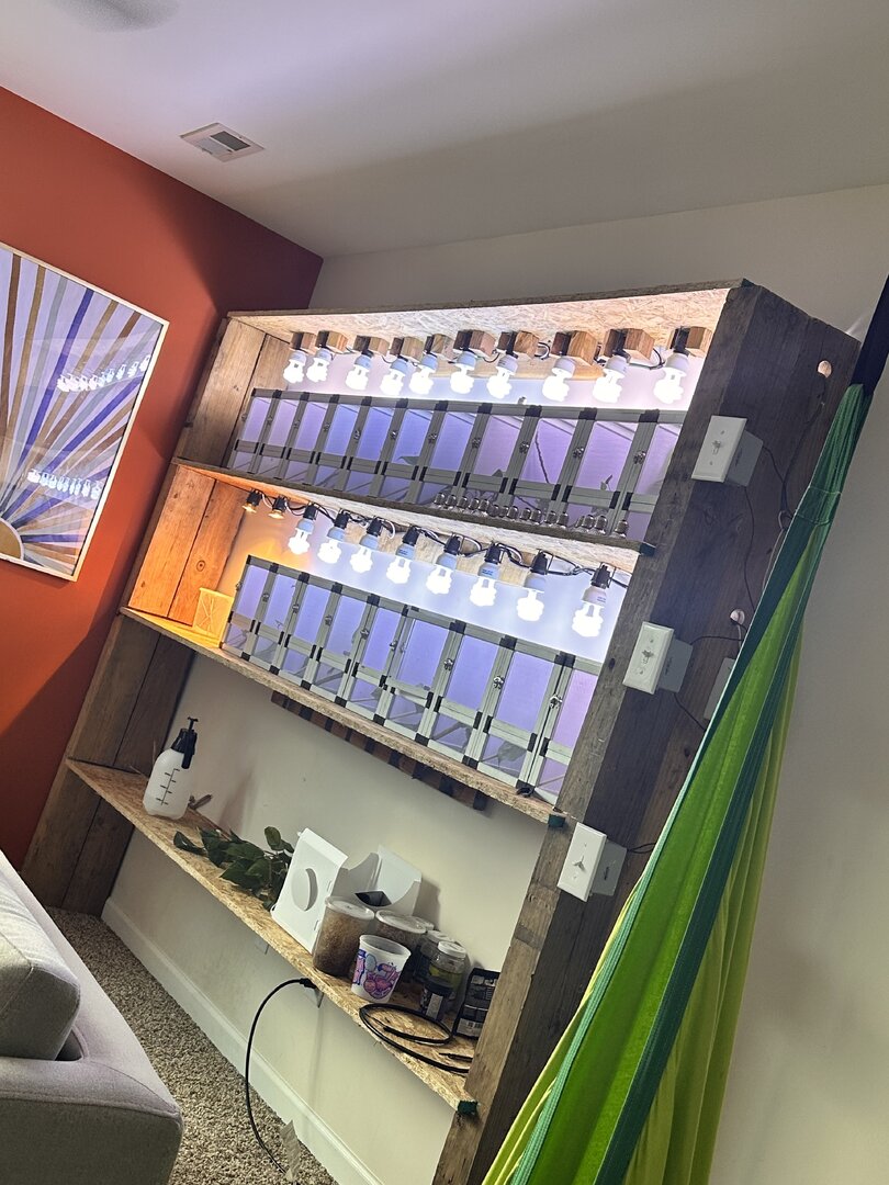 Can experienced breeders or hobbyists post some pics of their baby enclosures please? I just want to know how to make 20+ enclosures with lights for babies. I know some people keep their newborns all together for like 2 months but I need to build something like a shelf with enough space for chameleon from 0-4 months old chameleons. You would help me out a lot!