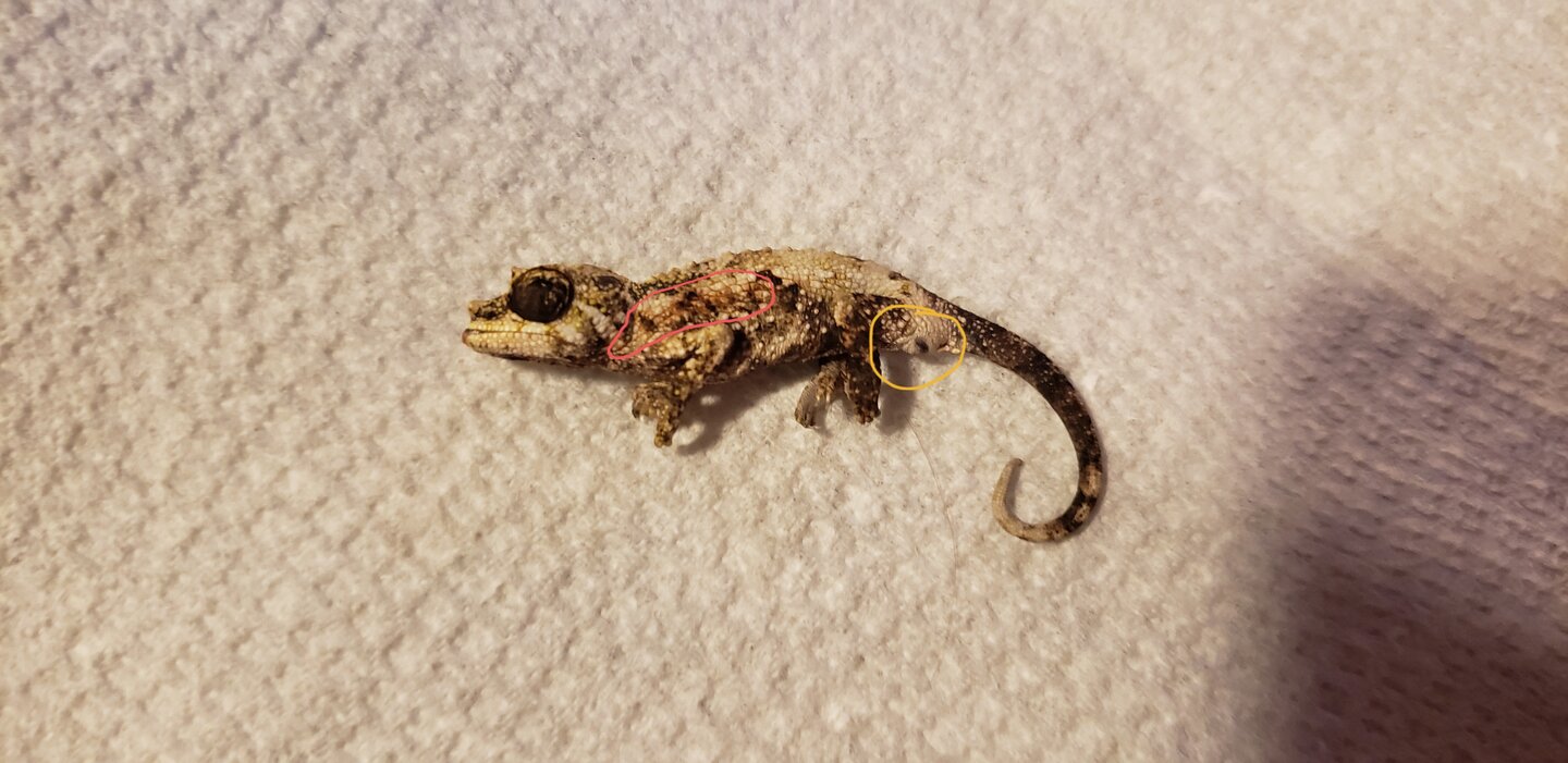 My Baby Chameleon Blue Ive had for about 5 weeks just out of no where died. This morning I put fruit flies in his cage to eat but he didnt eat any of them. Then around 12 I checked on him again, all of the flies were still alive in there and saw that Blue was sleeping. Later that day I checked on him again at 5 and he was sleeping again just in a different spot so I nudged him to see if he was okay and then he fell over. I caught him before he fell off the branch and he opened his mouth really wide and coughed, it kinda looked like he was gagging or choking, but he did that 3 more times, then he bit his tongue and died. But there was something strange on him, he has red lines coming from his lower jaw to the middle side of his torso on his left side. Also on his anus it was big and puffed up and black, it looks like it was clogged basically. I dont know what happend or what was the cause everything has been consistent with feeding, humidity, spraying, etc. But nothing has changed, so Im thinking it might be a parasite or something. I wanted to see what everyone thought. Also the picture im sending is after he died Im sending the original and the pic with marks to show where the red lines were.