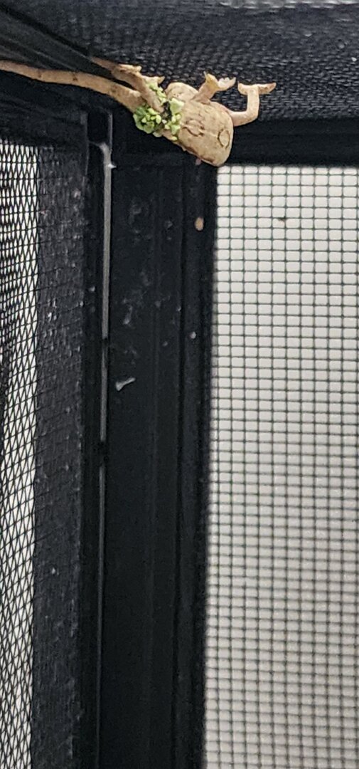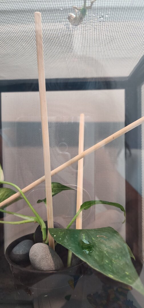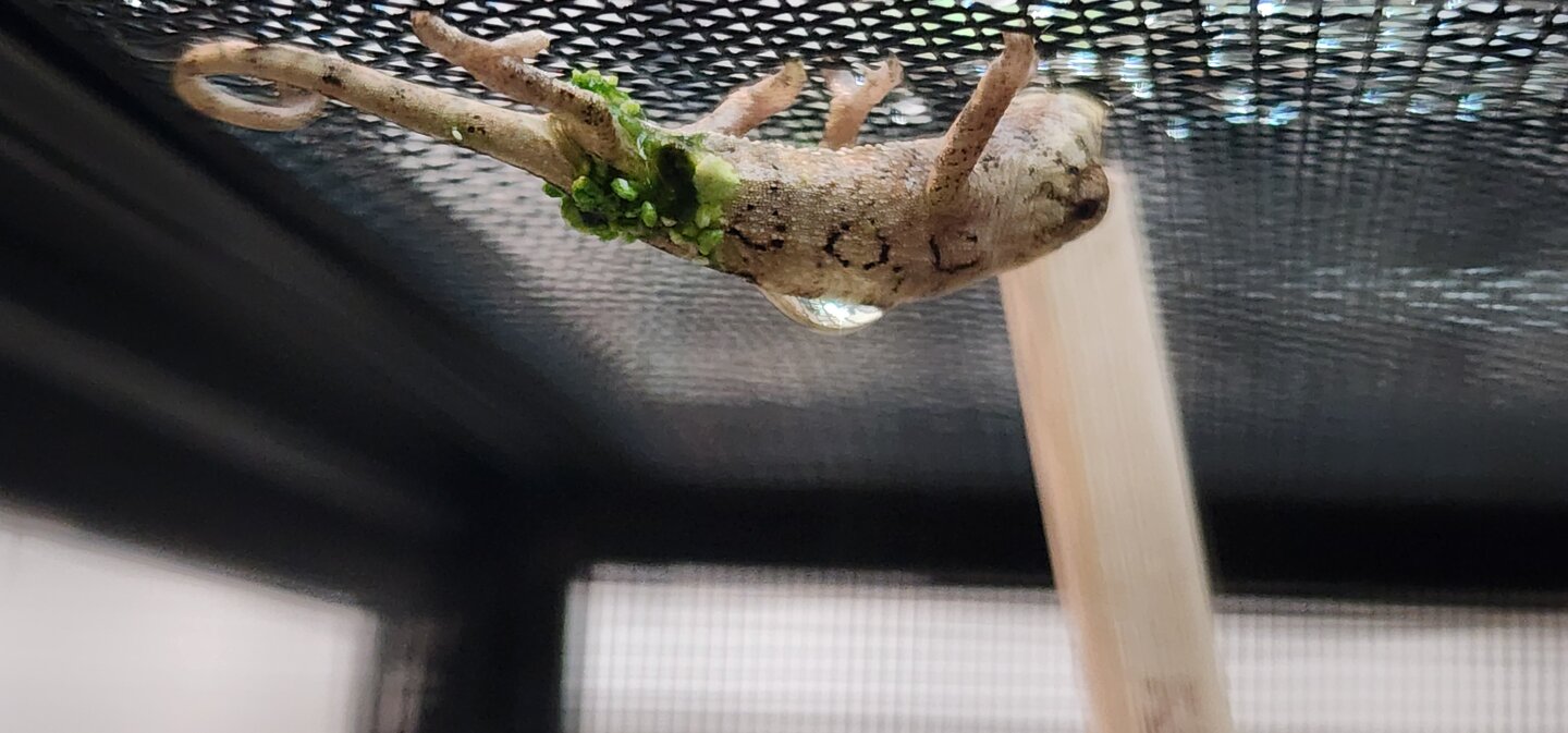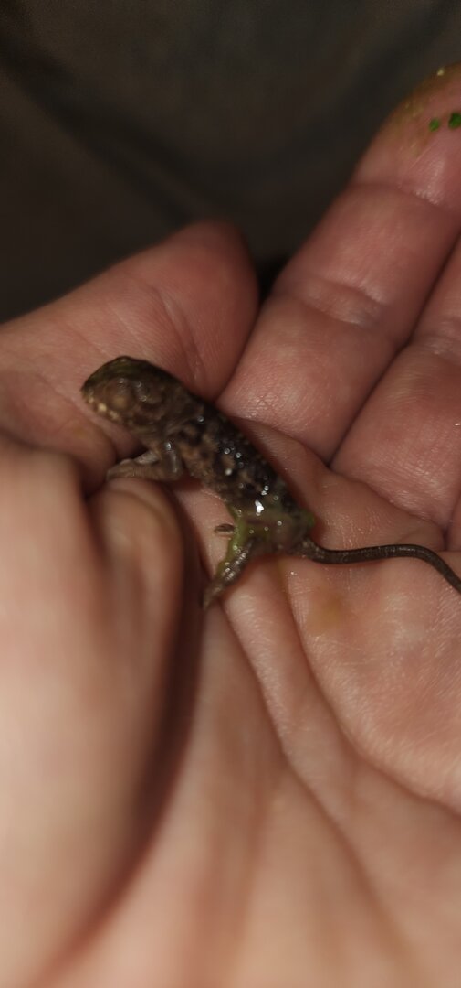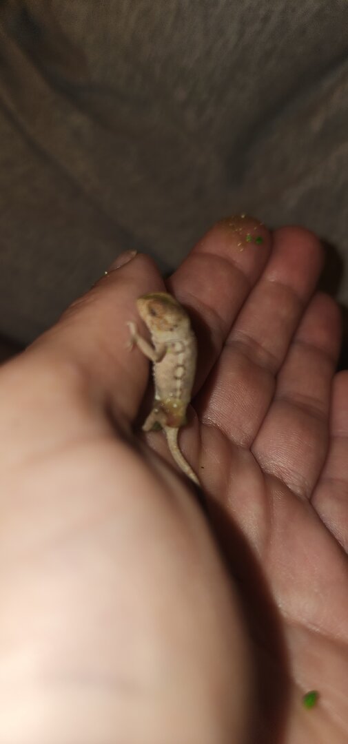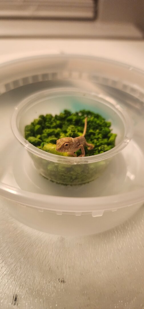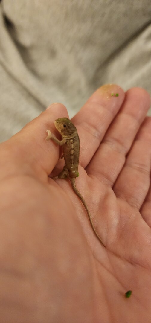 So several days ago it looked like our egg was shrinking but had a split in the side, I thought it wasn't going to hatch. I checked it tonight and saw just the head poking out but zero movement and everything was stiff, I thought I was too late. I gently squeezed it out of the egg, again no sign of life at all and please forgive me if this was the wrong thing to do, but after I gently pushed on its side a few times I stated to see it breathe!! It's now running around, very active. I have no idea what to do now. It was in a doubled container, one with green stuff and an outer one with water. I dumped the water (rinsed and dried it) and transferred the green stuff to the larger container with cham and a few leaves with stems from my other enclosure. What next?! He also has a wound like spot on his rear hip area, should this cause concern or normal?