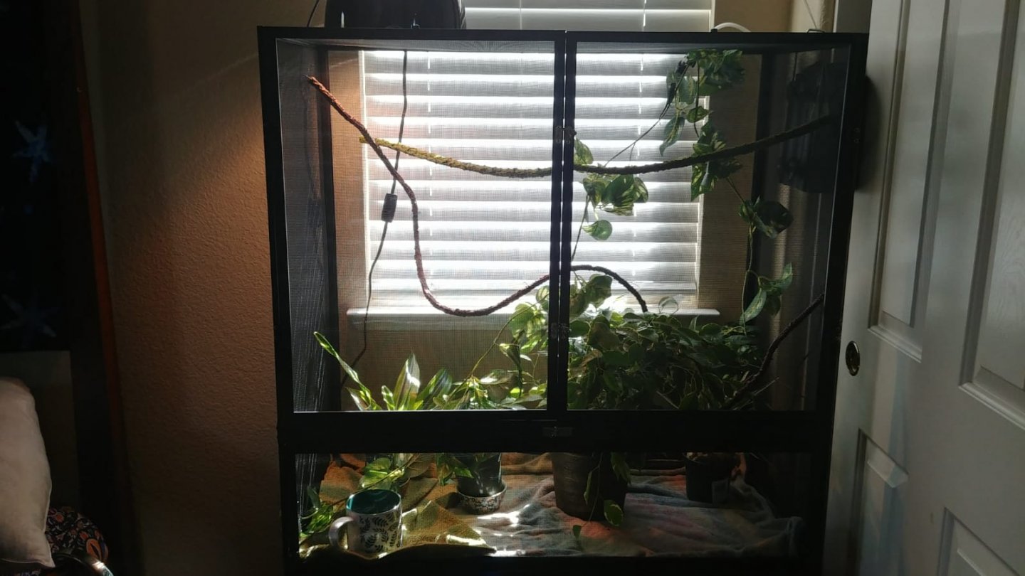 I think I messed up by putting her in a big cage too fast. She ate a few crickets since I got her, but not as much as I read she should be eating. Most days I'm lucky if she eats one, though she usually goes after medium/larger sized crickets. She doesn't hunt really unless I use the cricket tweezers to move one onto a screen near her or on the same branch as her. I tried cup feeding in a mug, but she's not going for it.