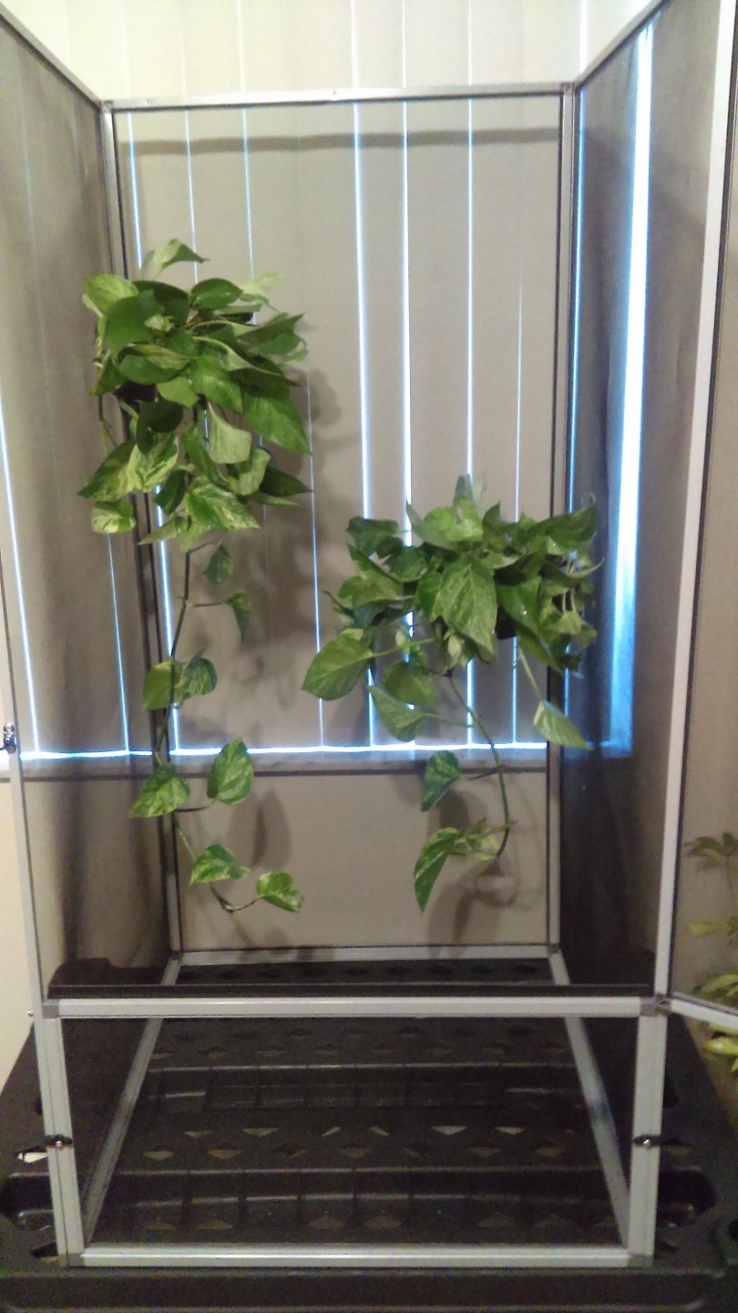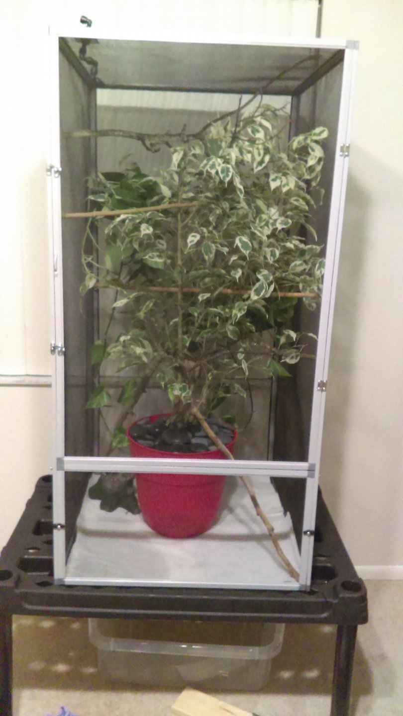 There are two Pothos: one hanging from the left back corner of cage and one from the right back corner of the cage. There is also a variegated ficus which takes up most of the cage. We also have several branches (oak, baked in the oven @250 degrees) and pieces of bamboo sticks (purchased from Lowes) for him to climb on.
