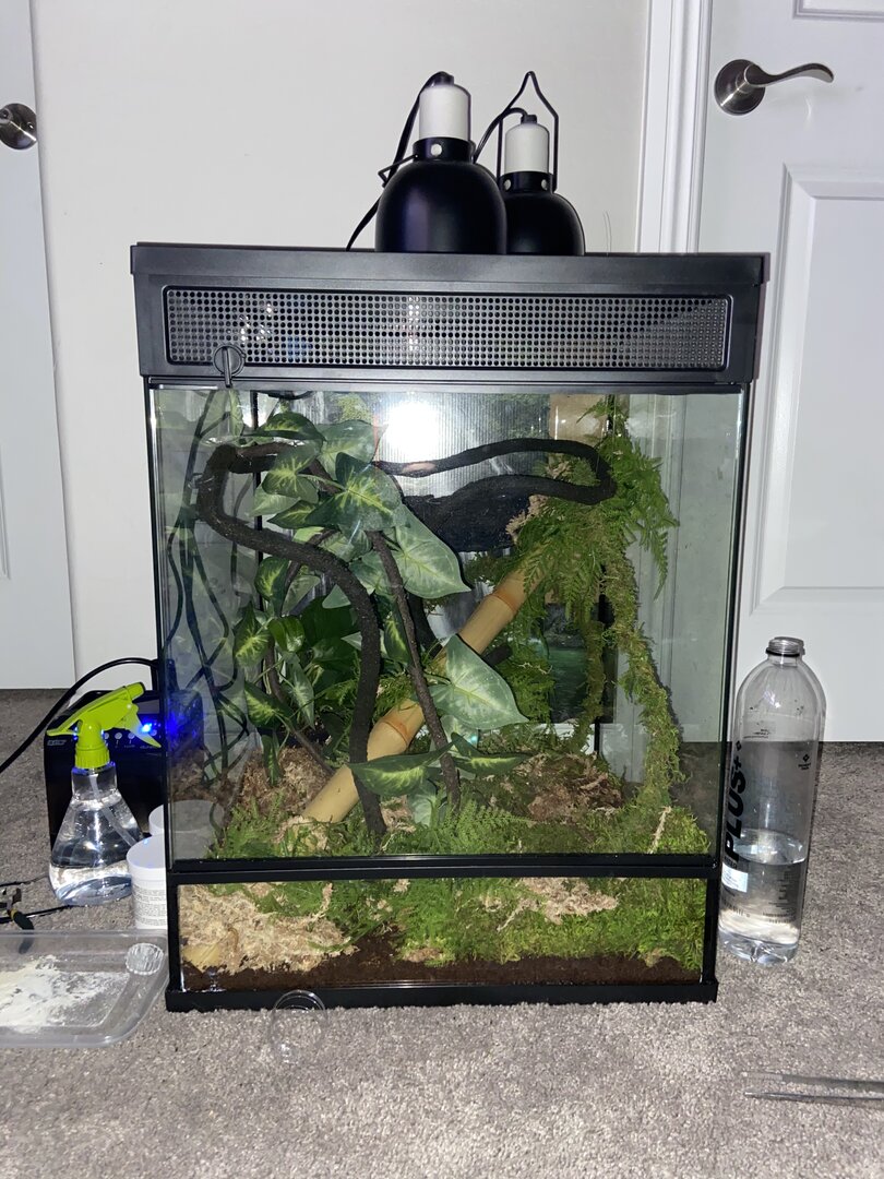 View attachment 261788recently picked up a veiled from petsmart(i know they aren’t the best but he seemed healthy) i’ve had it for a week and everything’s going fine but i have a few questions that i would love to have answered. first of all i’m unsure of its age they said a month old at the store and they told me it was a male. it seems to have the tiny spurs to show and it does have a small bulge. i keep his tank at about 50-65% humidity and it’s a solid 80 during the day and drops to about 70 at night. i have a monsoon solo kit with dual hoses set on a timer.do these temps and humidity % seem decent for my baby veiled? i’ve seen him digging once and i was afraid it was too hot so i adjusted lighting and lowered humidity just a little.