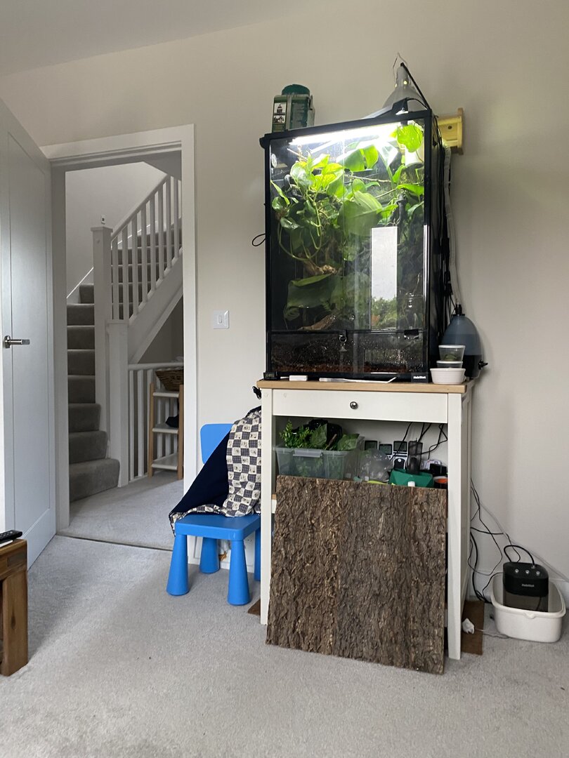 Feeding - Gutloaded locusts, dubia roaches (not many, he doesn’t like them, morio worms and silkworms (very occasionally).
