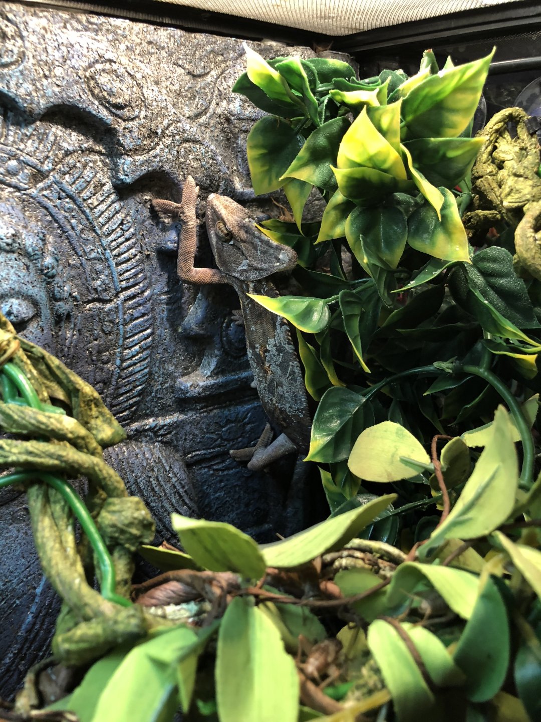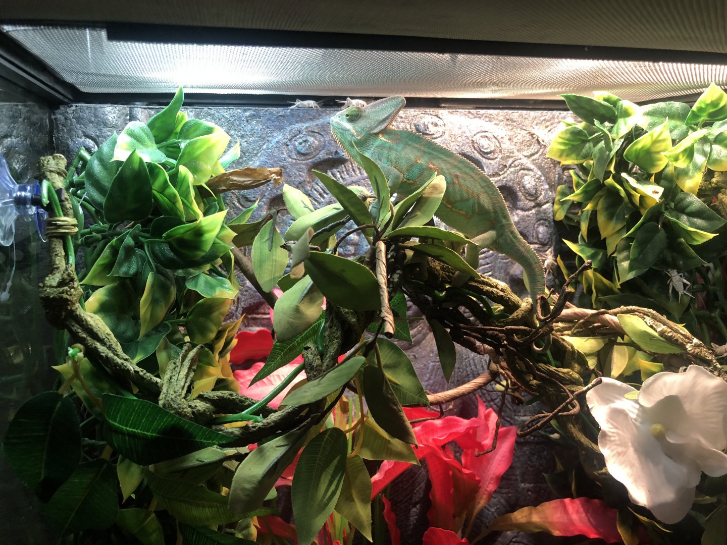 my 6 month old male veiled has has to bad sheds in 3 weeks. I have plenty of vines and greenery for him to rub against. The shed seems stuck . I had tried misting more and even tried putting him in a container with a little warm water for 30 minutes. He has been dark for several weeks and has lost his beautiful green color. He is only vibrant when sleeping. Is there anything I can do to help him? Or is this something that resolves itself? Here is an picture of the cage. This photo is before his first bad shed, but you can see the cage.