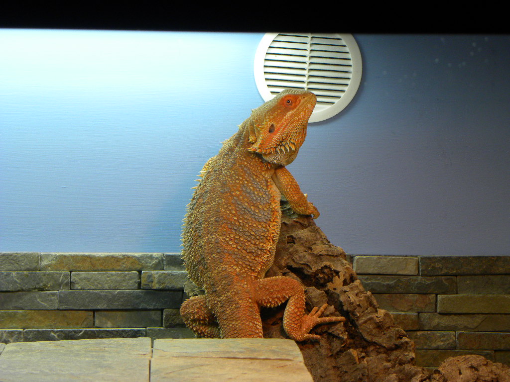 This is the highest he's ever climbed up his cork log. I think he's trying to hide because he just destroyed three of the plants in his enclosure, while ignoring a perfectly delectable bowl of veggies & dusted supers.