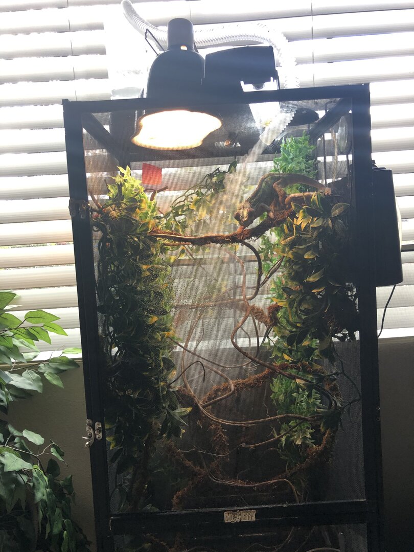 This is a hotly debated topic: captive orthodoxy vs. Natural hydration. There are not easy answers here. Orthodoxy has is to hydrate when they’re awake, ‘cause that’s when they drink. Natural hydration says humidity nearing 100% at night is more in keeping with the natural humidity cycle, and the chams loose less moisture to respiration during the night, so their drinking requirements during the day are diminished. The idea is to mist before lights on to create a nice dew-like mist on the leaves for morning drinking, little to no misting during lights on, and misting just after lights out, with fogging starting at 3 or 4 am and ending before lights on. The idea is high humidity at night, drinkable dew in the morning, humidity drop during the day, and humidity rise at night.