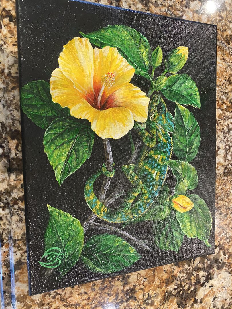 My grandma has an amazing hobby of painting and for my birthday she took one of my favorite photos of Coda and mixed it with a hibiscus tree from her garden and this is what came out. It took around 32 hours to do. This will forever be my favorite painting.