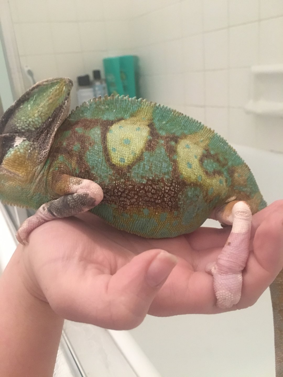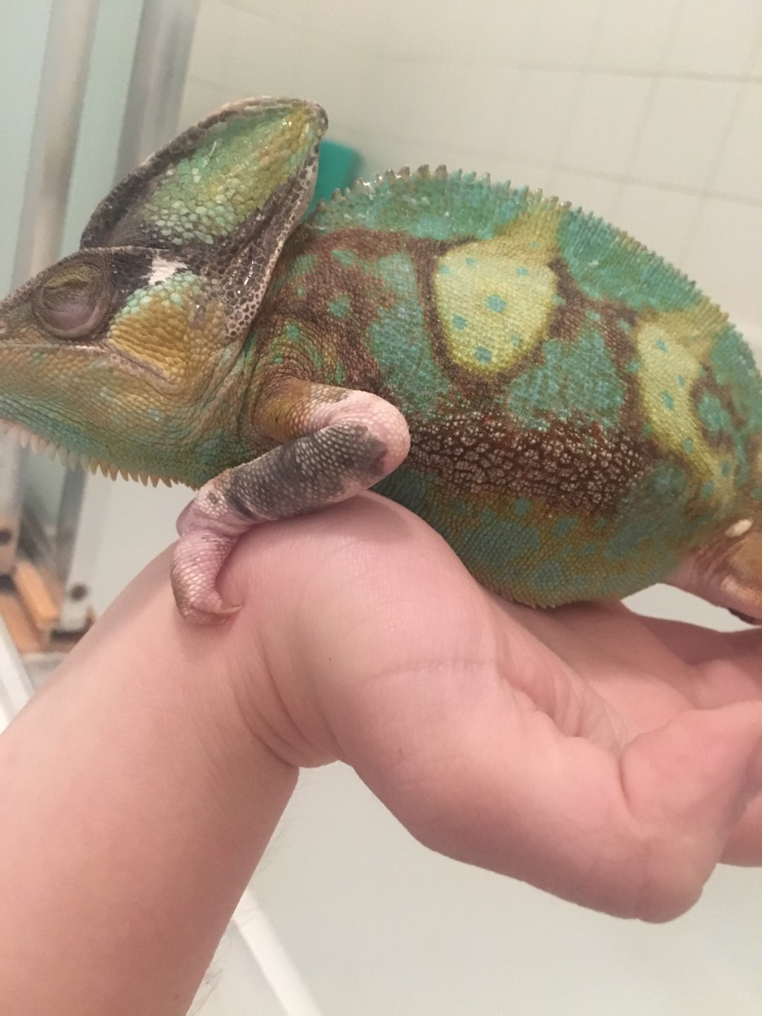 Hey so I have a year and a half vailed chameleon. Today around noon while I was at work my brother noticed he was keeping his right eye shut and was sinking it in. When I called the breeder he said maybe something is suck in it and to put him in the shower to see if he could get it out. I noticed while I was looking at him his belly is big and he seemed almost in pain? I'm not sure but like he had a belly ache? Idk what to do