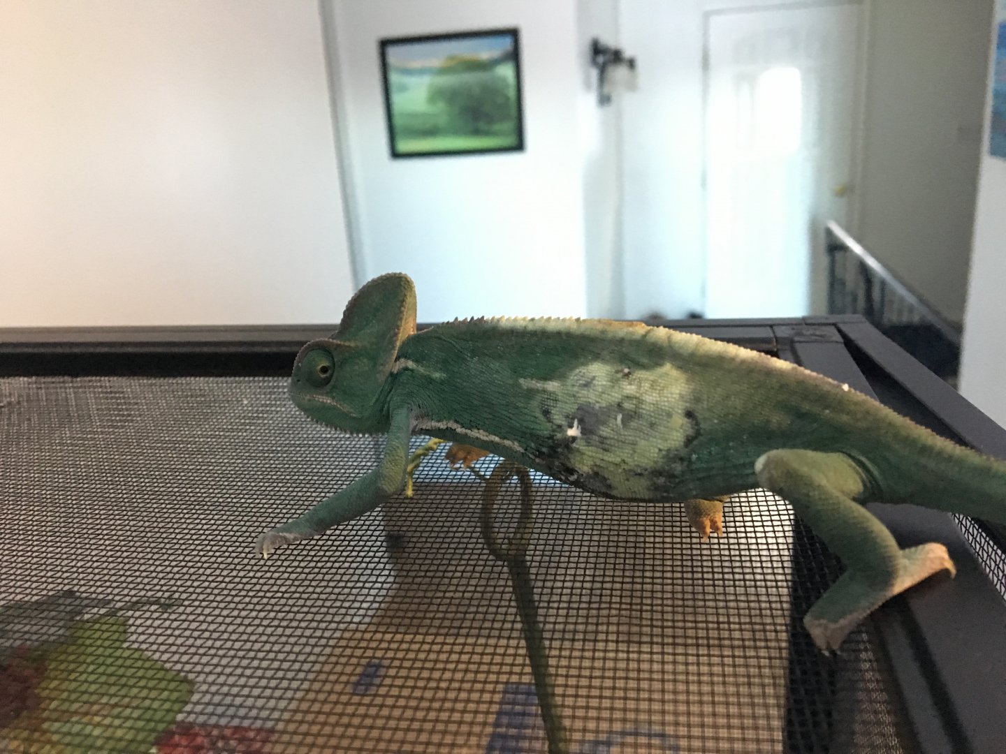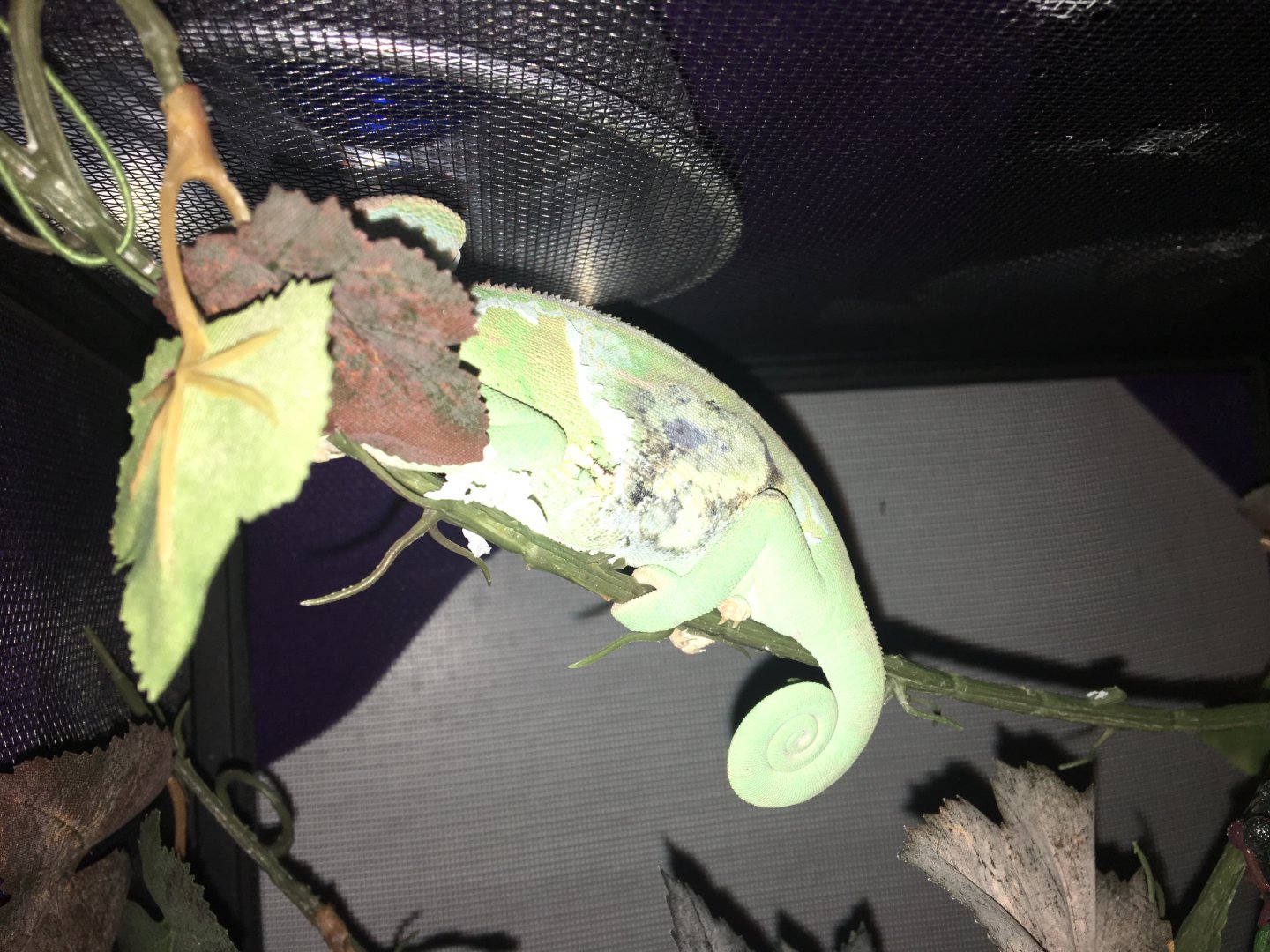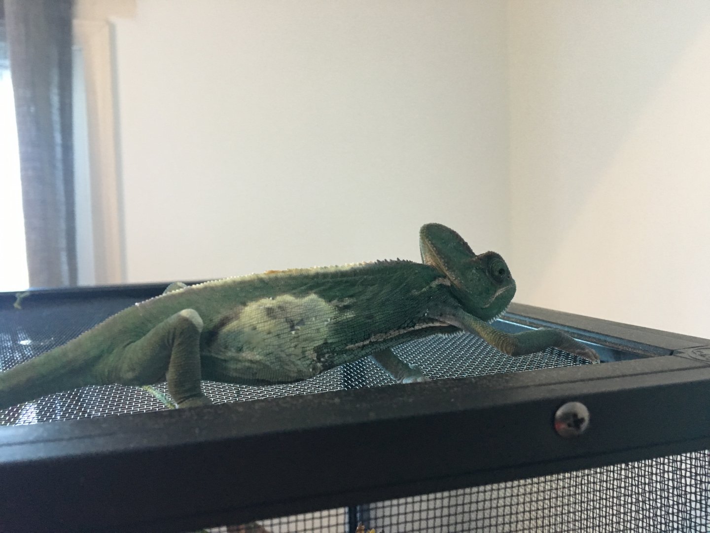 I just adopted this 8 month old veiled chameleon from someone who was moving and couldn’t take her with them. She was beautiful and green and friendly.