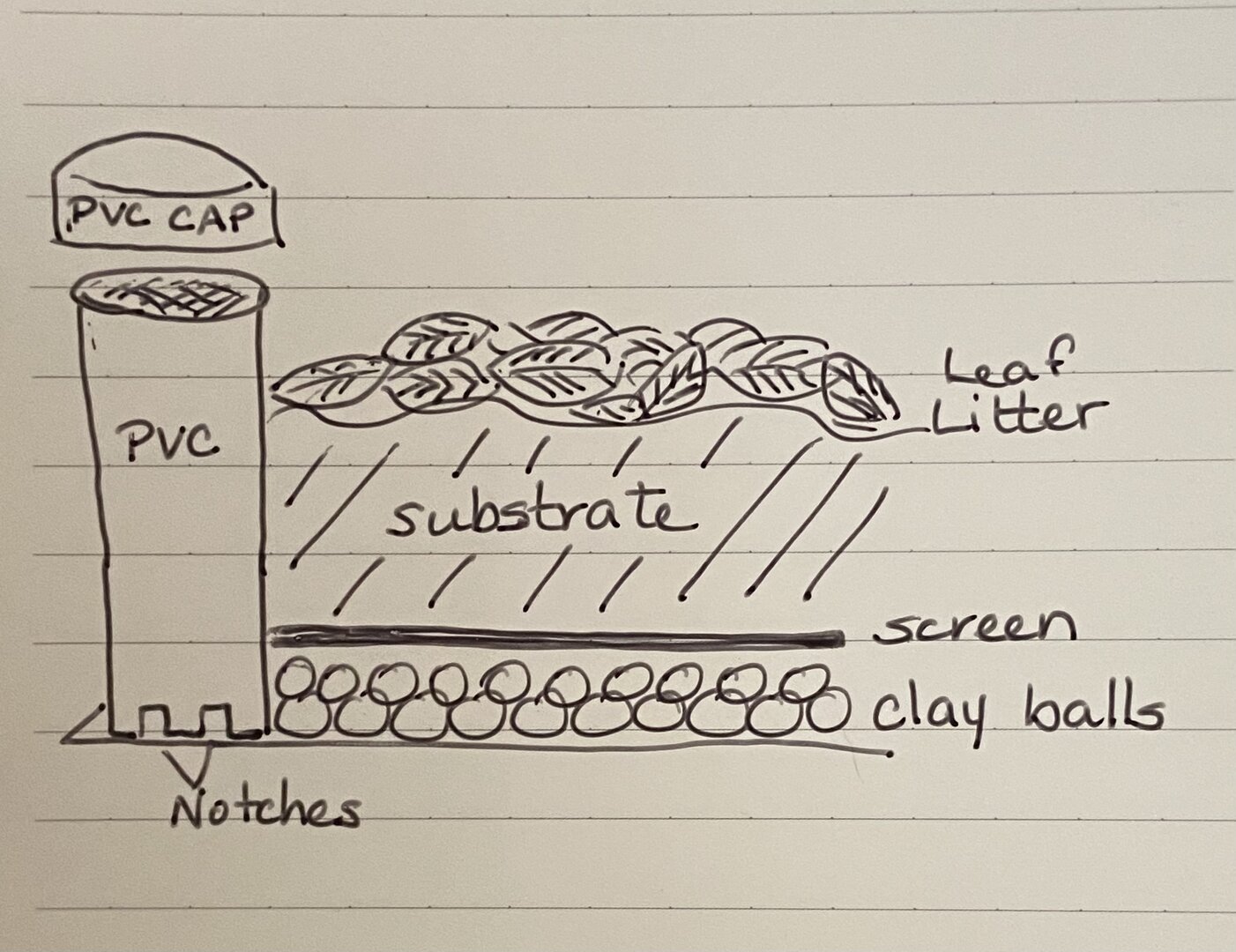 The very first consideration is what will you be using to hold your substrate? If you have an all glass enclosure or other solid enclosed bottom, you will need to have a way to remove excess water from the bottom. The simplest way is to use a pvc pipe. Put some notches on the bottom where it will be in the drainage layer. Have it extend a bit above the top of your entire substrate and use a cap. When needing to be drained, simply remove the cap and however you will be doing it, remove the excess water. *If it were me, I’d be using a small wet vac. I use fabric root pouches sitting on top of ReptiBreeze substrate trays with my all screen enclosures and I’ve never had any need to remove excess.