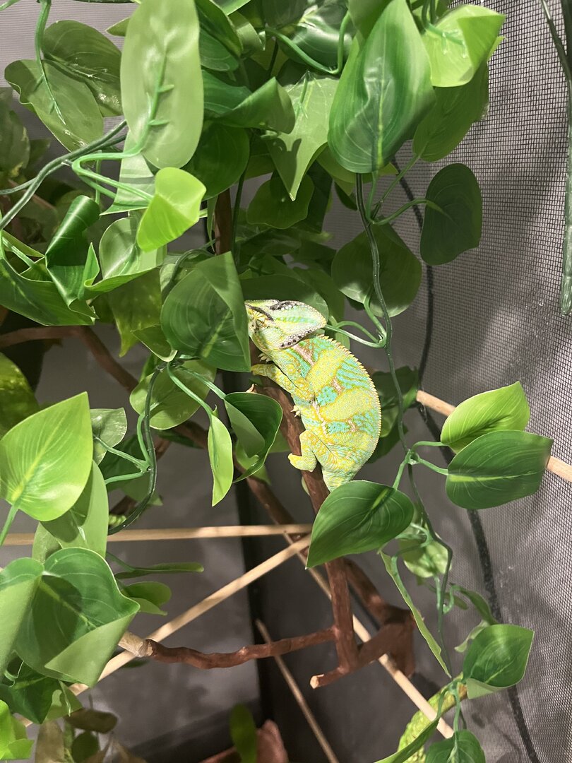 Hi! I’m not sure about the black spots. Could be an infection of some sort. Something I do want to comment on is the use of fake plants in your cage. Fake plants are very dangerous for veileds as they often like to nibble on their plants. Fake plants can cause a deadly impaction if ingested. I would recommend switching all those out for real chameleon-safe plants asap. The people on the forums can help you pick out the right plants for your cham.