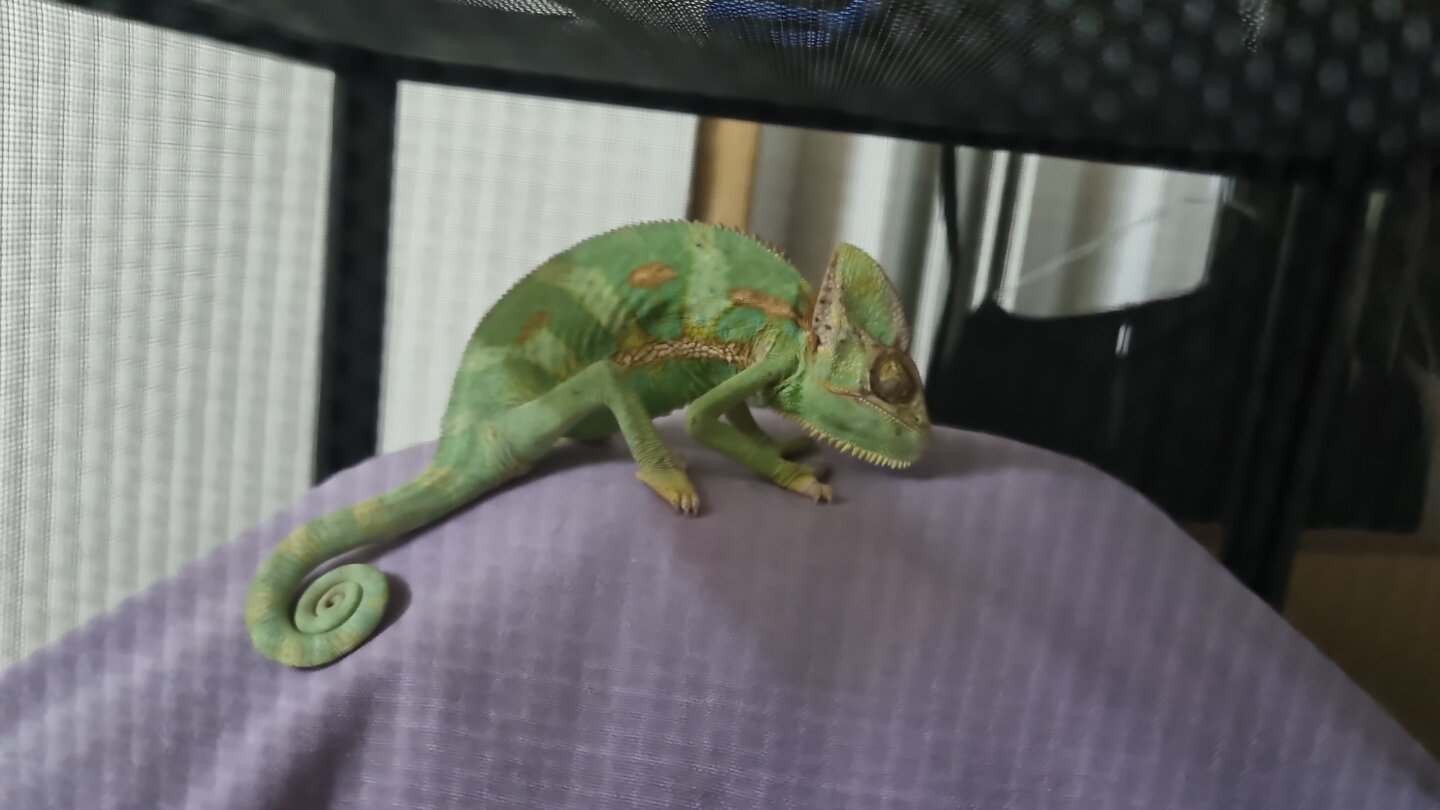 I have a veiled cham, male, 7 months old, who was in a very terrible husbandry situation: temp 15°C, no uvb light or heat source, no water acces, no suplements...