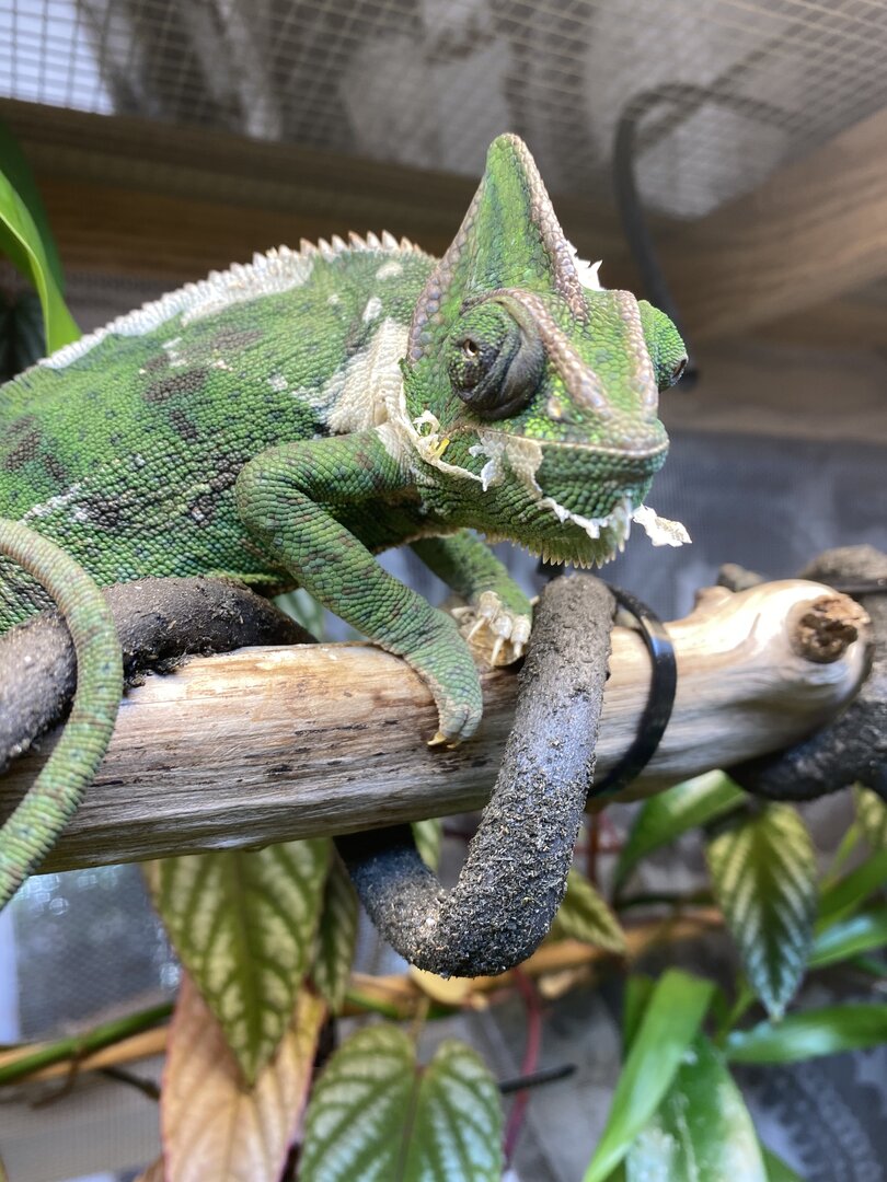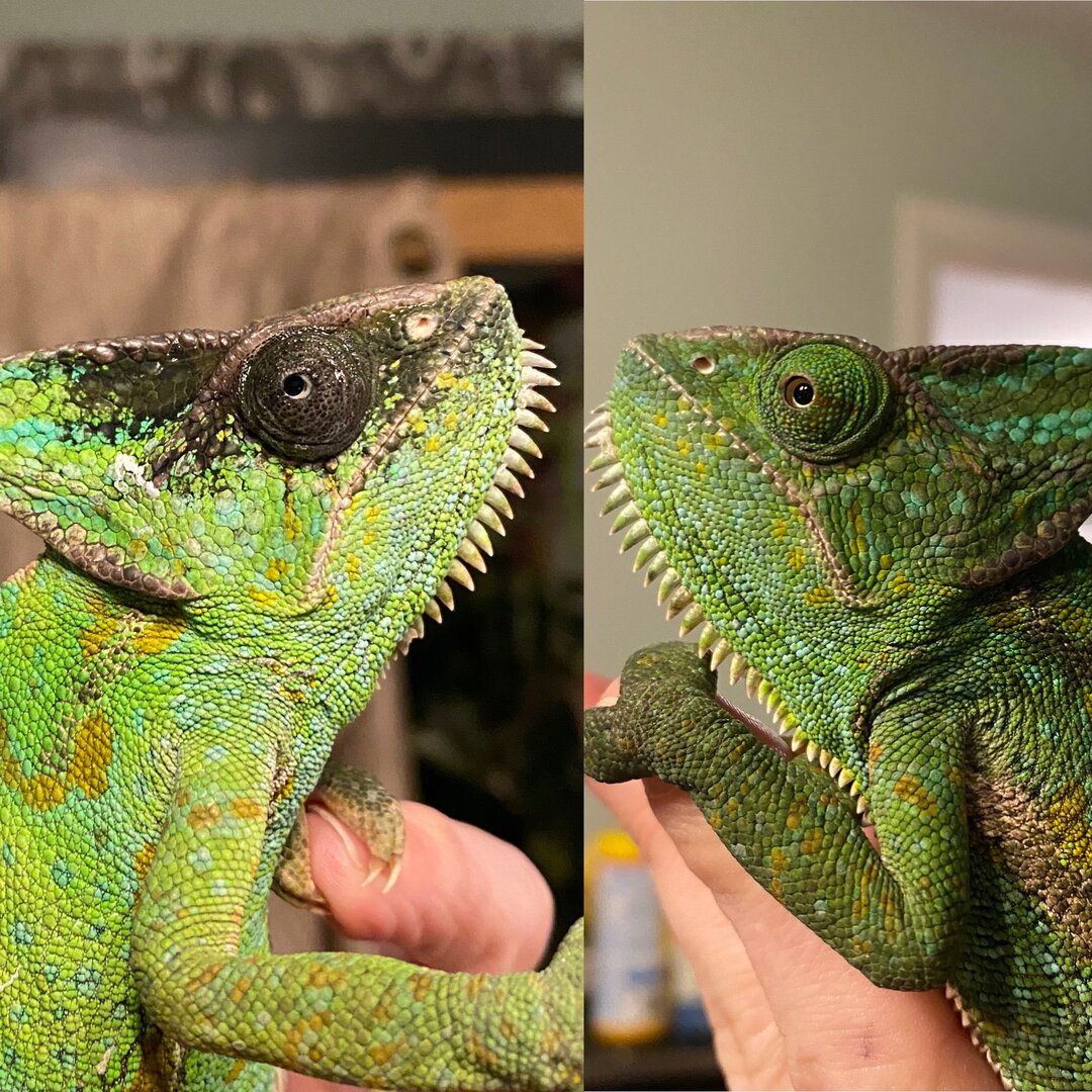 Starting December 6th my female veield2 1/2 year old (we think- she’s a rescue from 1 1/2 years ago) chameleon’s right eye has had problems. It started one day right in the middle of her shed.