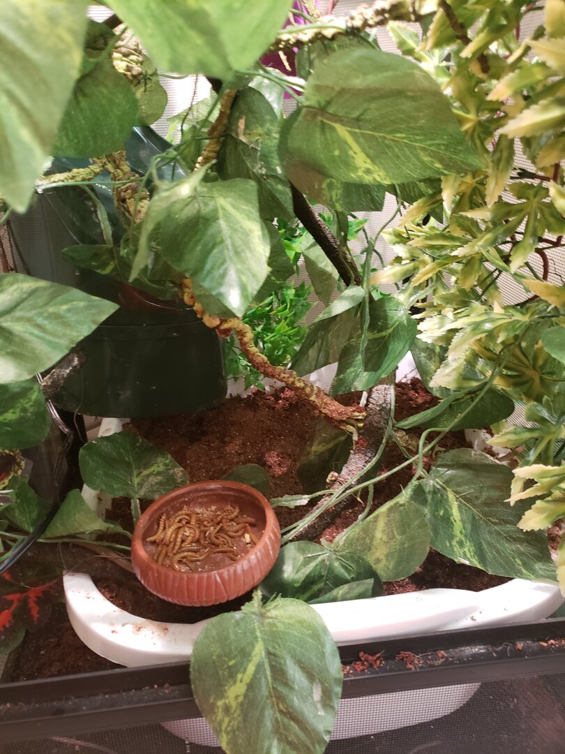 Does this look ok? The green plastic thing is her water fall, I used reptile substrate and burrowing sand mixed, it is really moist so it will hold it's shape, I put some mealworms in her dish with extra calcium (not in the photo) anything else?