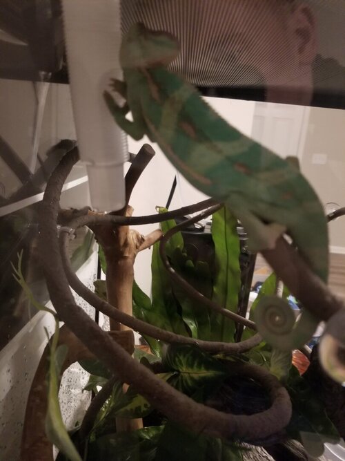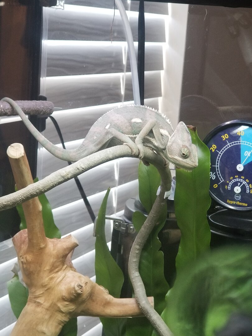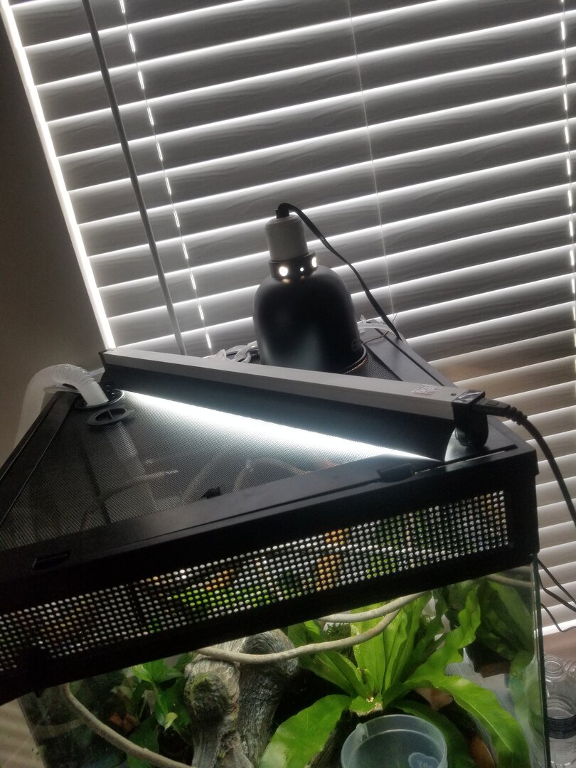 Am using a 100 watt bulb because the house gets really cold and ive been having trouble with humidity. His humidity is like at 30 when i get home so i got a humidifier anyone know what might be causing it if its just a cold problem or maybe stress. There has been gnats that got inside too and im not sure if that is also bugging him but i was assuming not. Also the guage the big letters are the humidity and the small ones are the temp right?