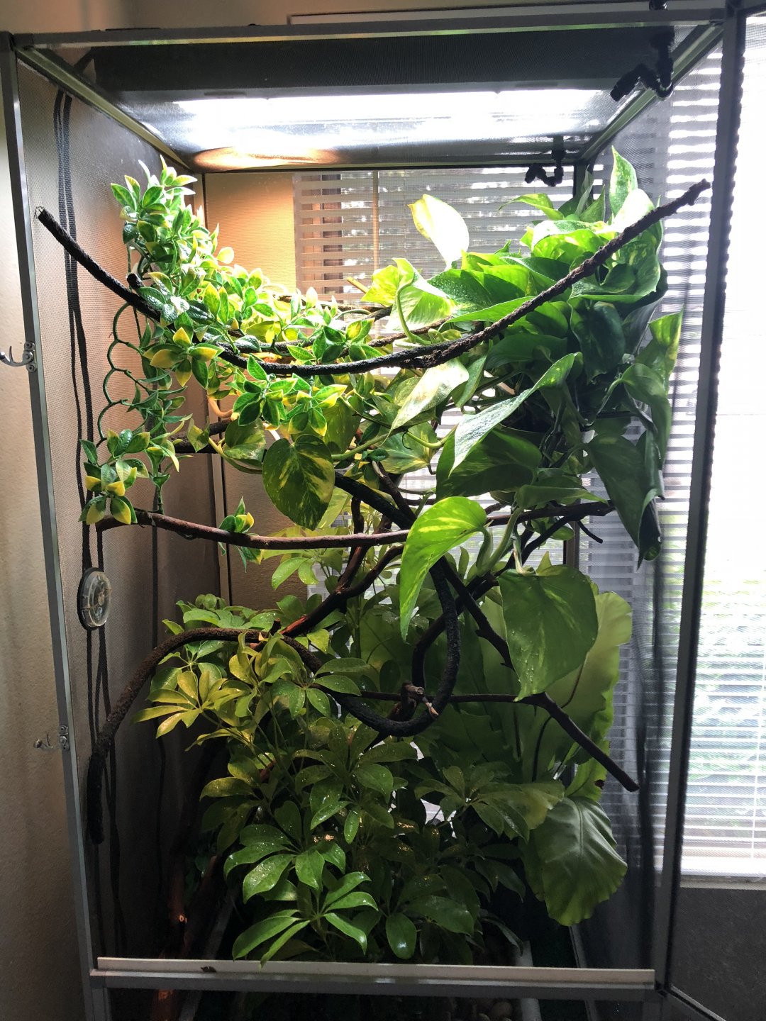My first question is about the enclosure I have built for him. Is it too cluttered?