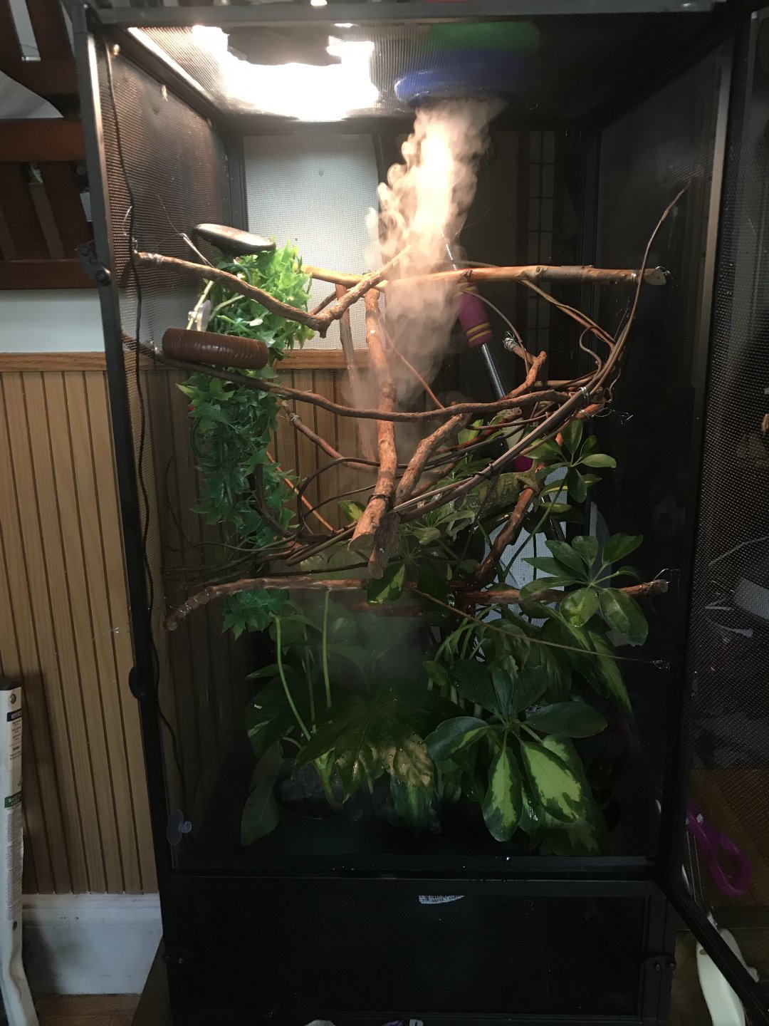 - Watering - What kind of watering technique do you use? How often and how long to you mist? Do you see your chameleon drinking? I spray water with regular water spray bottle multiple times a day, drying in between. I have fogger, little dripper and cool mist humidifier- I have seen him drink from the dripper but I think he is dehydrated because his eyes are sunk in. I monitor all levels obsessively and the humidity will not go up