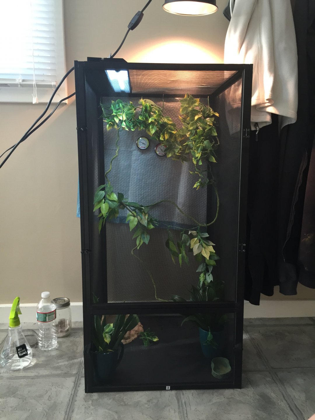 The enclosure style was a good choice. I like the fact that you bought her a pothos for the enclosure....now go by two more. Lol. The more live plants in there with her, the better. Humidity will be more easily maintained, more leaves equal more drinking opportunities and the ability to hide is very important..especially when chameleons are this size. You will also need more horizontal branches running throughout the enclosure. This is important for thermoregulation.