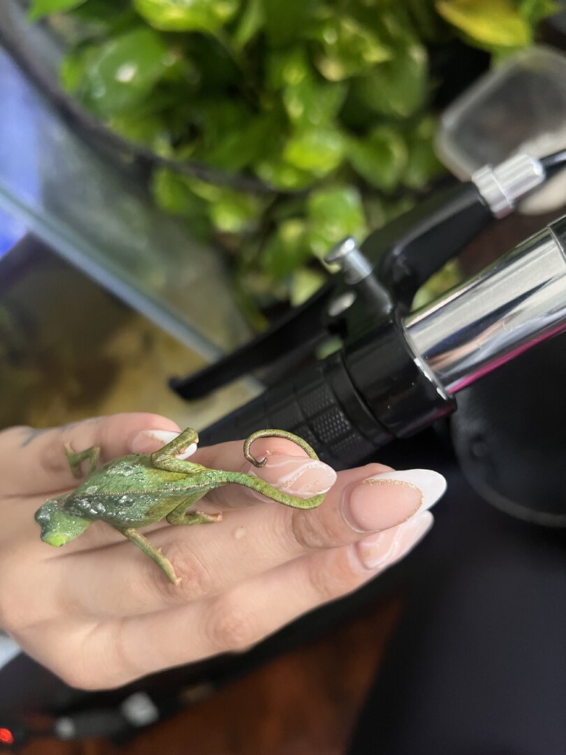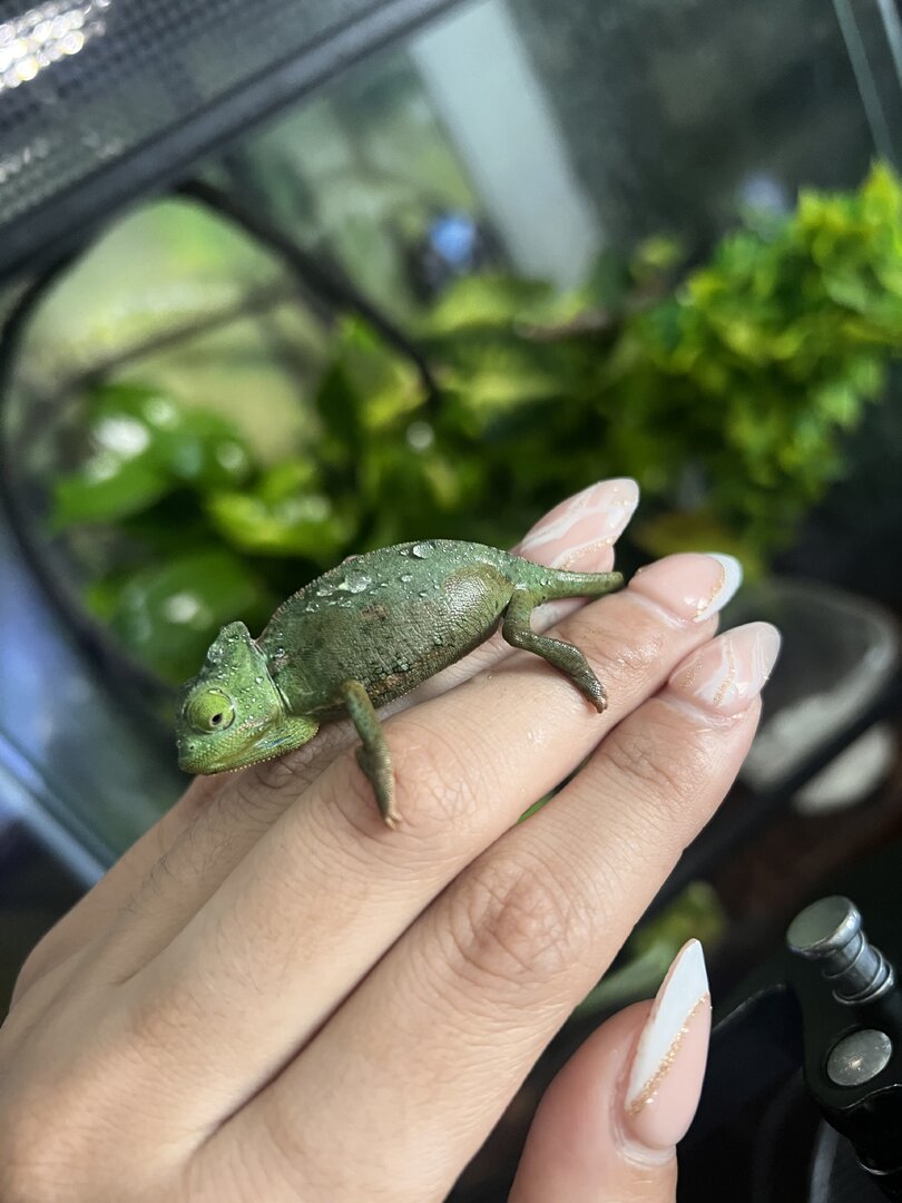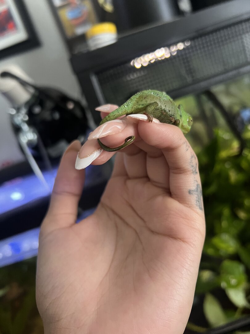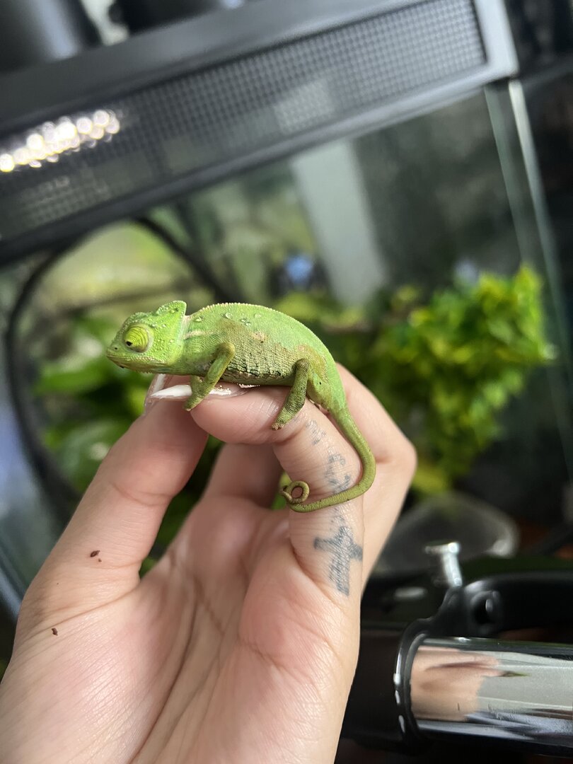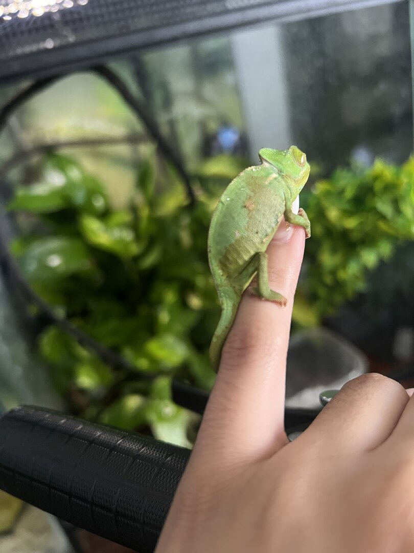 My baby Cham has some brown discoloration that I noticed yesterday. He has brown on his tail up to his sides and on his feet and elbows. I’m thinking maybe he climbed up the cage and was sitting under the heat lamp and burned himself although I’m not sure.