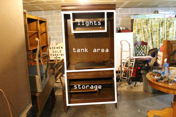 Front: The front is going to be made of glass, with a strip of mesh at the bottom to allow airflow (think of the vents on an ExoTerra tank) and the Dark Area on either side of the lights will also have a mesh front. It will be a sliding door, not one that swings open.