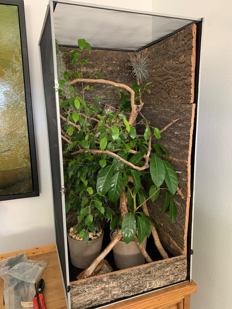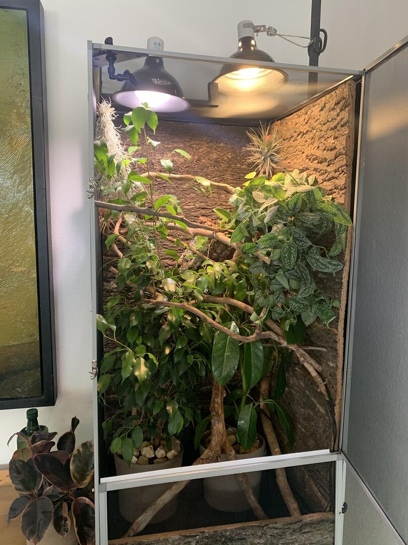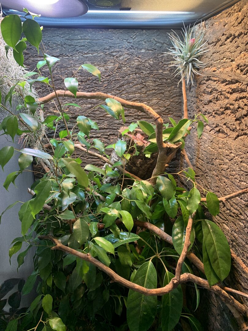 there's a little Madagascar Jasmine in the back corner under the air plant (wanted to give my chameleon a little plant that reminded him of home)