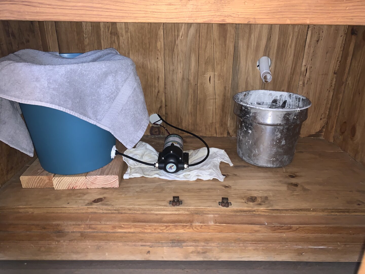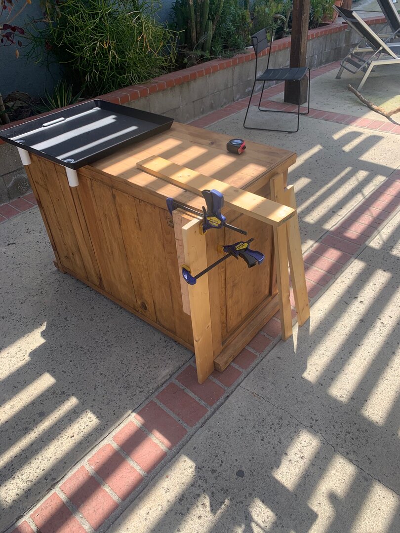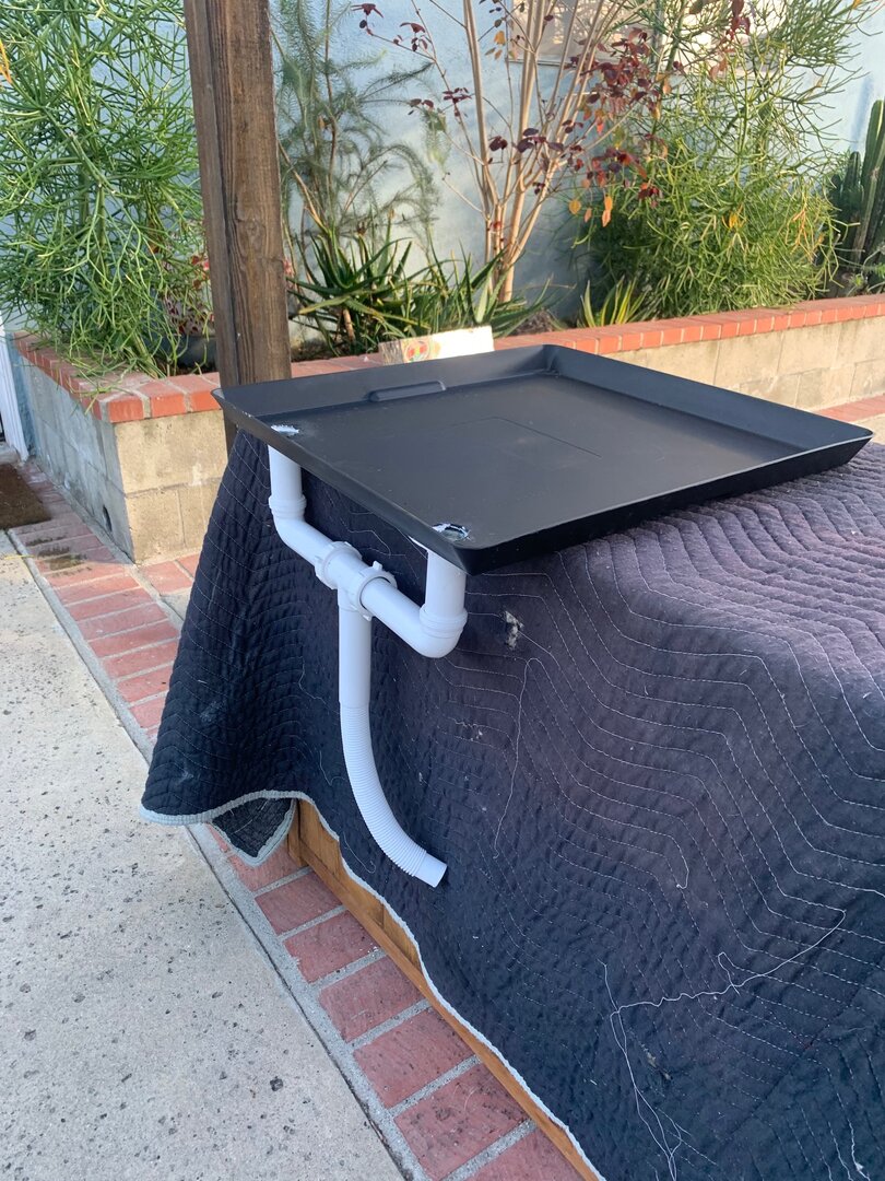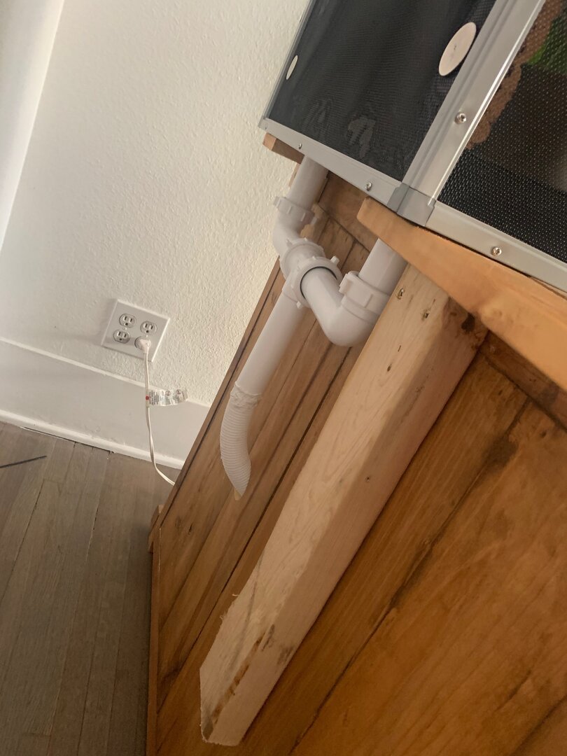 Bought a cabinet off of Craigslist for the cage to go on, but it was a little to shallow (about 2 inches) So I build a small addition to the back. Below you can also see part of my drain system (drip pan and some plumbing)