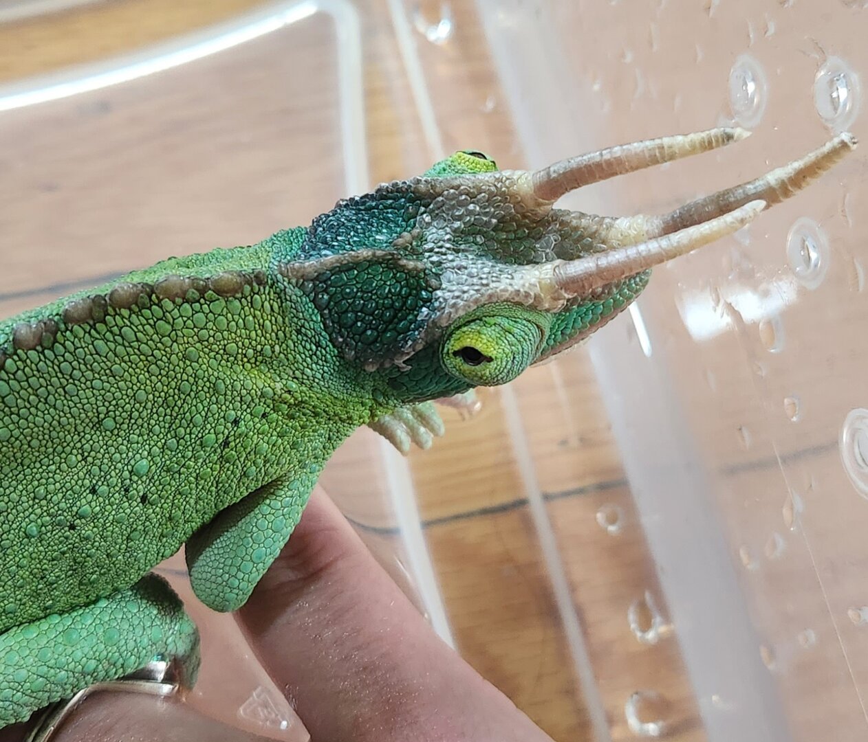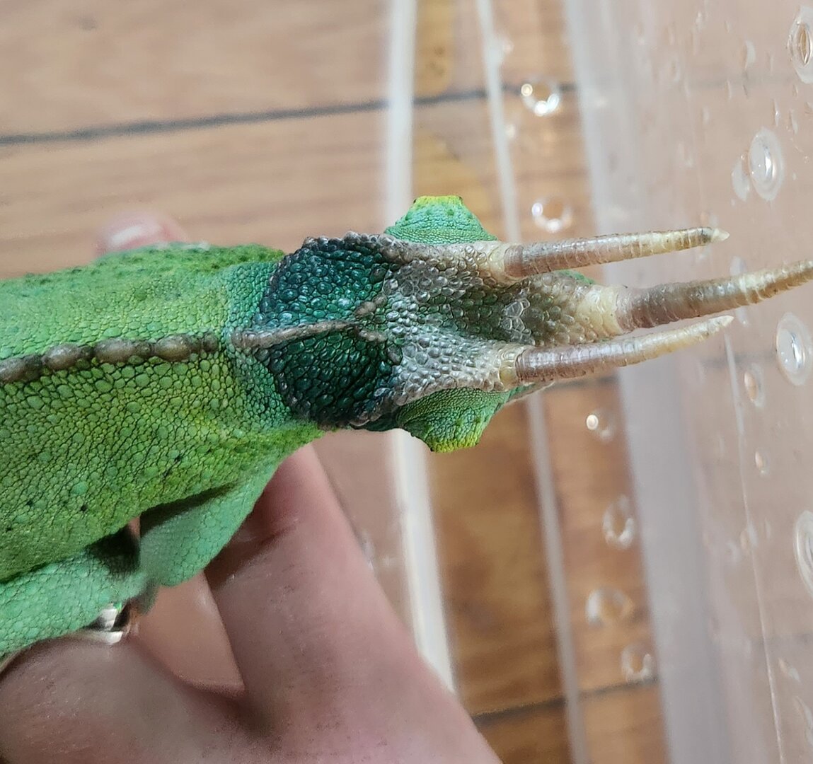 When I look at pictures of TJX chameleons, their crest just looks so much more green. It doesn't seem like it's hurting him but it could be constricting around his horns. Is this normal or not? If not, what can I do to help? He's otherwise a pretty healthy dude.