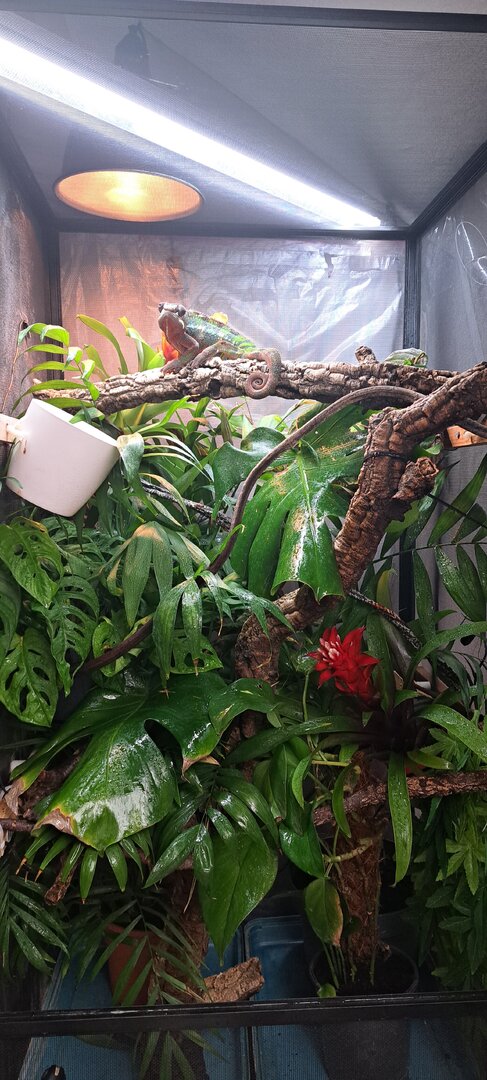 I renovated his cage yesterday however he had fake plants for the last 2 months due to wool lice. When handling the wool lice I cleaned his branches with pure natural vinegar and water. I always clean his cage with this. General clean every week deep clean every few months depending on the season. I also deep clean his misting system once a year. I always try to make sure the vinegar is rinsed with the water.
