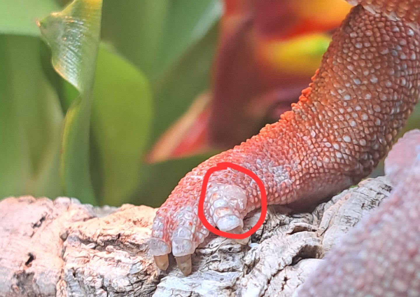 He has a small pink bump on his toe. It feels and moves like skin. I put some pictures. They aren't very clear so I'm sorry about that.