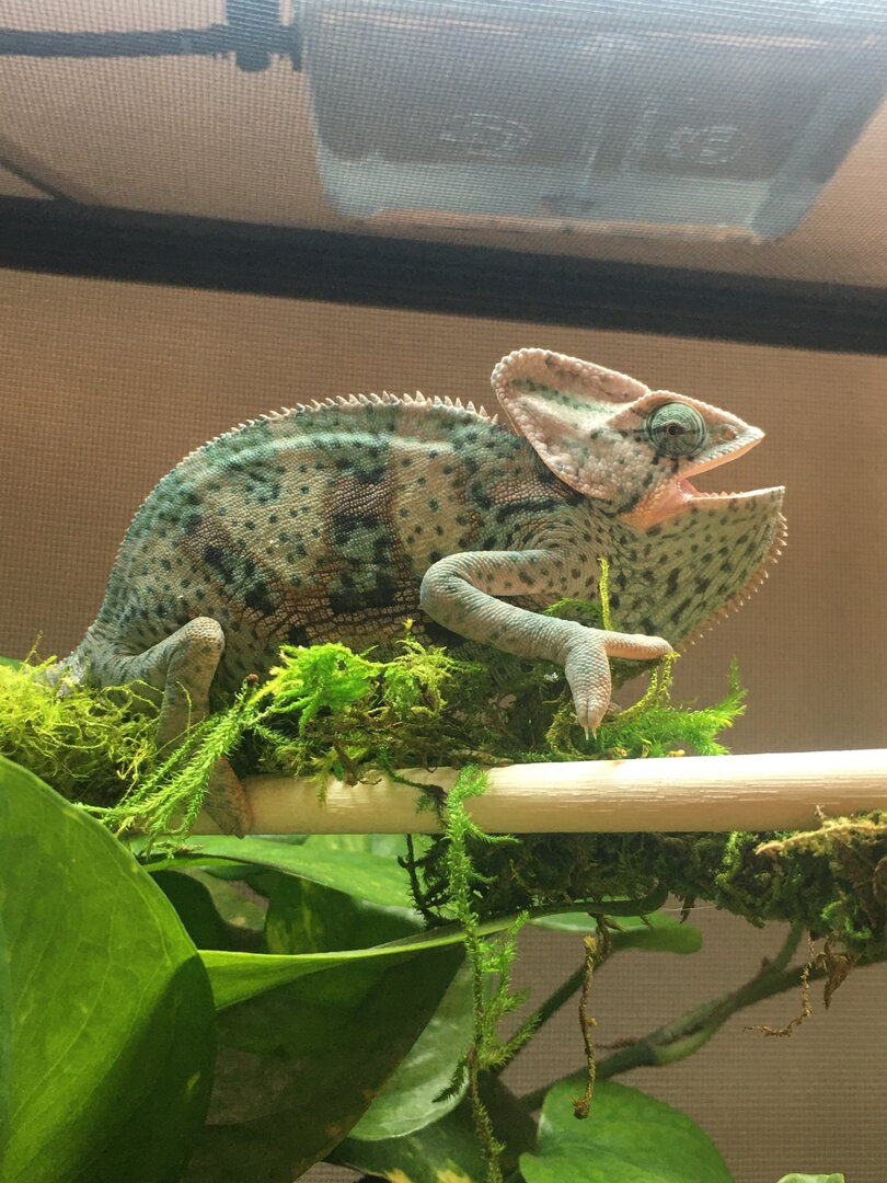 I recently expanded my veiled's cage to his adult enclosure. Ever since they change (yesterday), he has been with his mouth open and covered in spots (see pic below). I don't know if anything is wrong with him or if he is adjusting to his environment I caught him eating dirt yesterday, so i don't know if that is related to his odd behavior. His basking spot is also a higher temp: 90-95 degrees. Overall, Is my husbandry good? Is his new enclosure good? Anything helps. Unfortunately, I don't know his age, so if you know approximately how old he is that would help a lot. Here are the pics of the cage and his weird colors.