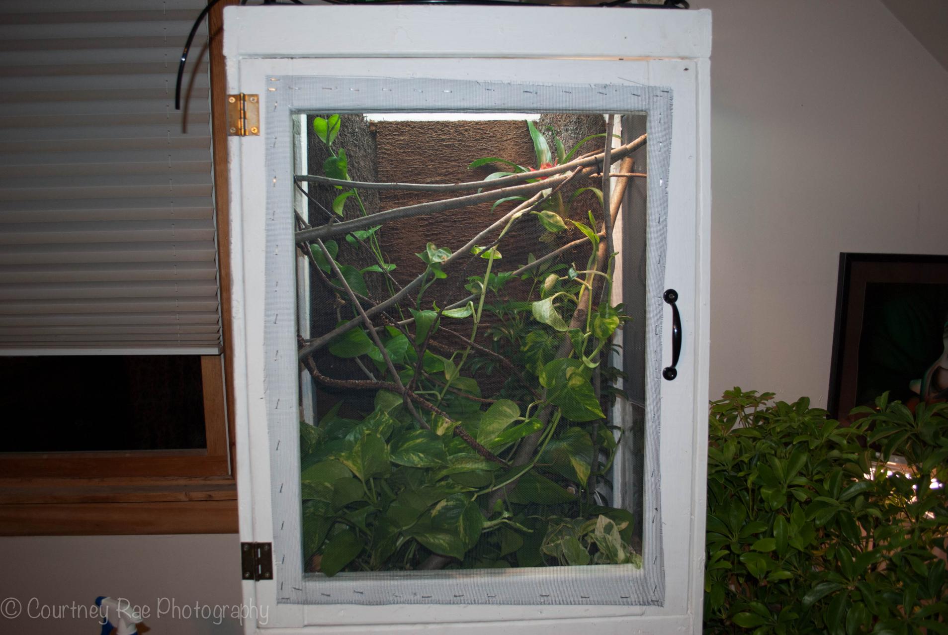 Cage: 24x18x36. The back and bottom third of both sides are acrylic, the rest is screened in. The back has tree fern panels and orchid slabs attached.