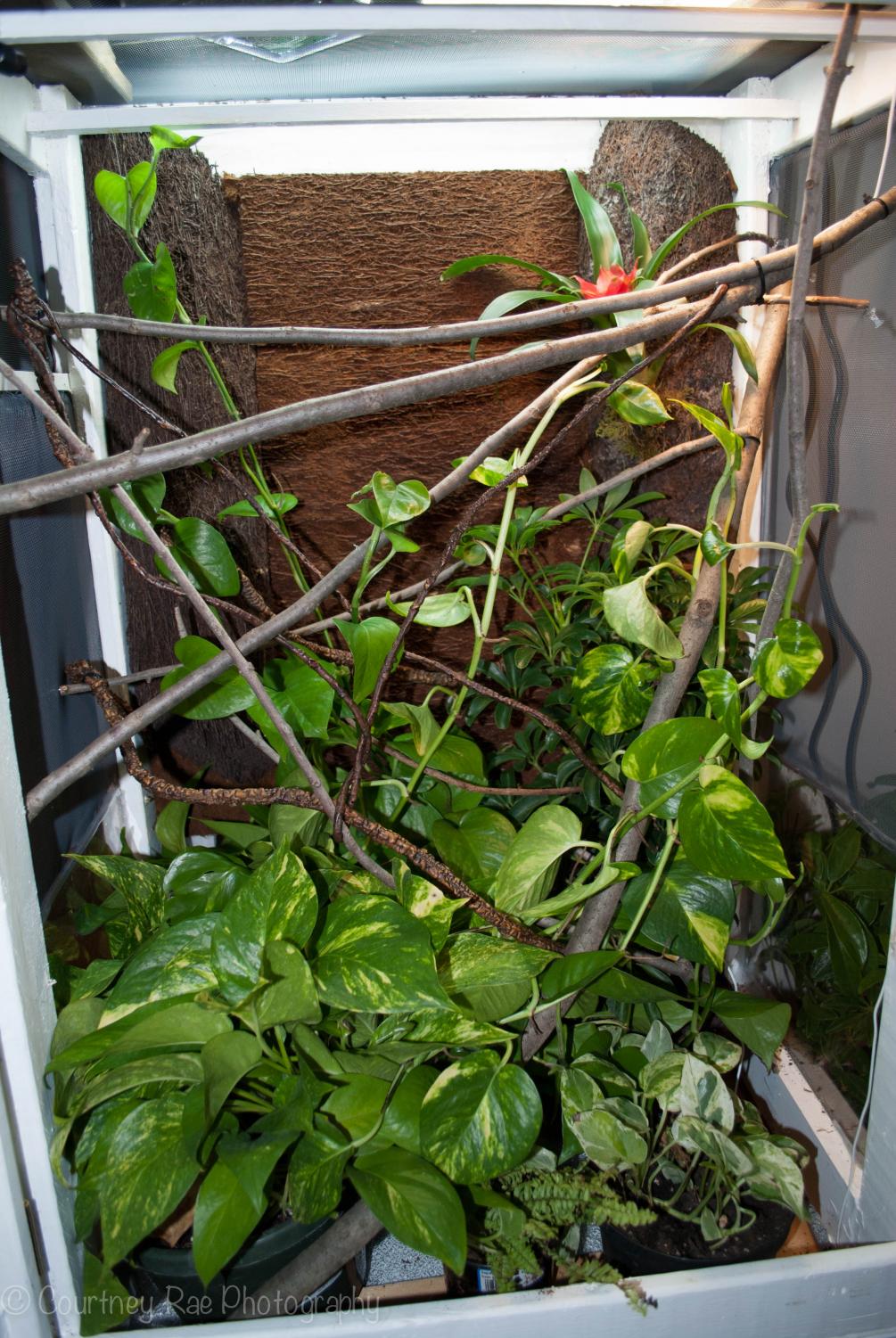 Plants: This cage contains two very large pathos, a small pathos, and a small fern to make the bottom of the cage. There is also a bromeliad and a miniature schefflera. I am going to add another broom or orchid to the back wall, and another plant down bottom. All are washed and replanted in organic soil and covered with stones. I was also thinking of adding some bright moss to the back wall, and a branch or two. Any suggestions on how to do that? Also I seen to be infested with knats!!! Whats the best way to take care of this problem? Sand on the top half inch of plant soil?