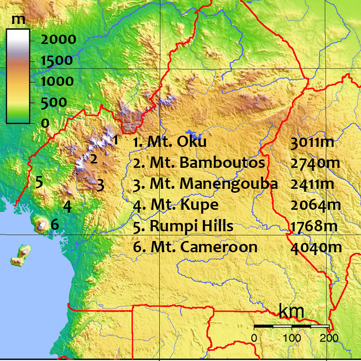 If you are interested in hearing more about the Cameroon Chameleons you can check out my World Chameleon Species Tour blog here on the forums and listen to his interview on the Chameleon Breeder Podcast. But before you do that take a look at this map and keep this in mind while you are listening. This is of Cameroon in Africa. Do you notice the mountain range that starts in the Gulf of Guinea as islands and then "cuts" through the border of Cameroon and Nigeria? This is the Cameroon volcanic line and it is in these highlands that many of the species that Cameroon is famous for live.