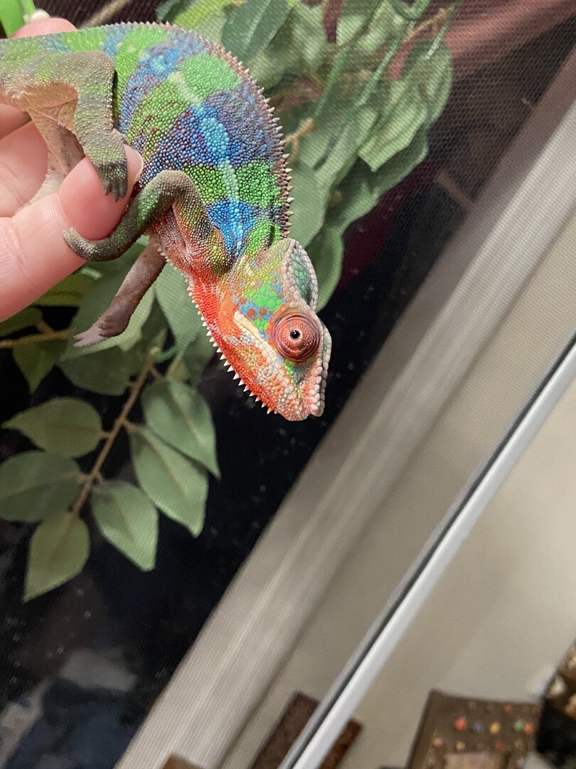 Bolt fired up at a baby hornworm for 2 weeks. Now, hornworms beware cause Bolt is a on the prowl. He just ate grasshoppers immediately. His first day with me, I greeted him with 5 baby grasshoppers, 3 silkies and 2 hornworms. He immediately ate the hoppers and did not touch the worms. So I gave him 5 additional crickets which he gobbled down. Take a video of Bert's reaction. Bert is older so he might question this new thing.Bert was so spooked out by hornworms. I kept offering smaller and smaller…like…comically small hornworms. He eventually decided to eat one. Now he eats any hornworm haha