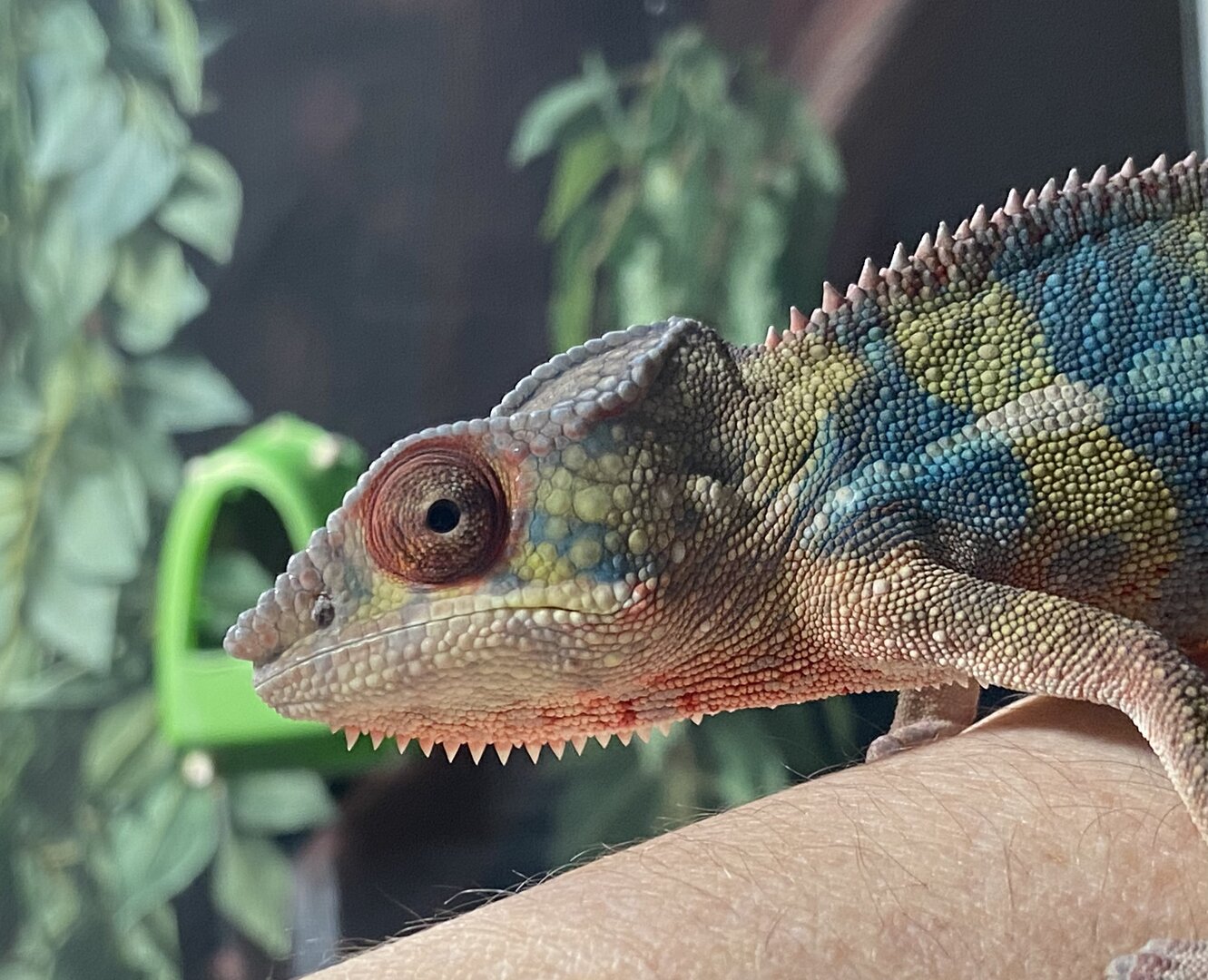I still think he is the prettiest cham!I’m still giving Bart anywhere from 10-12 + feeders daily of about 1/2” size. He’s going on 7 months old and empties his feeding station within minutes. He’s not showing any signs of over-eating. He is however, having the winter blahs with his colors fading. The weather here has been crazy and I’m having to turn the heat on at night and then the ac during the day. Maybe that is why? It’s the exact time of year when Jack got his winter blahs a few years ago. Mango is right next to Bart and doesn’t have the blahs. I wonder why some panthers get them and some don’t?