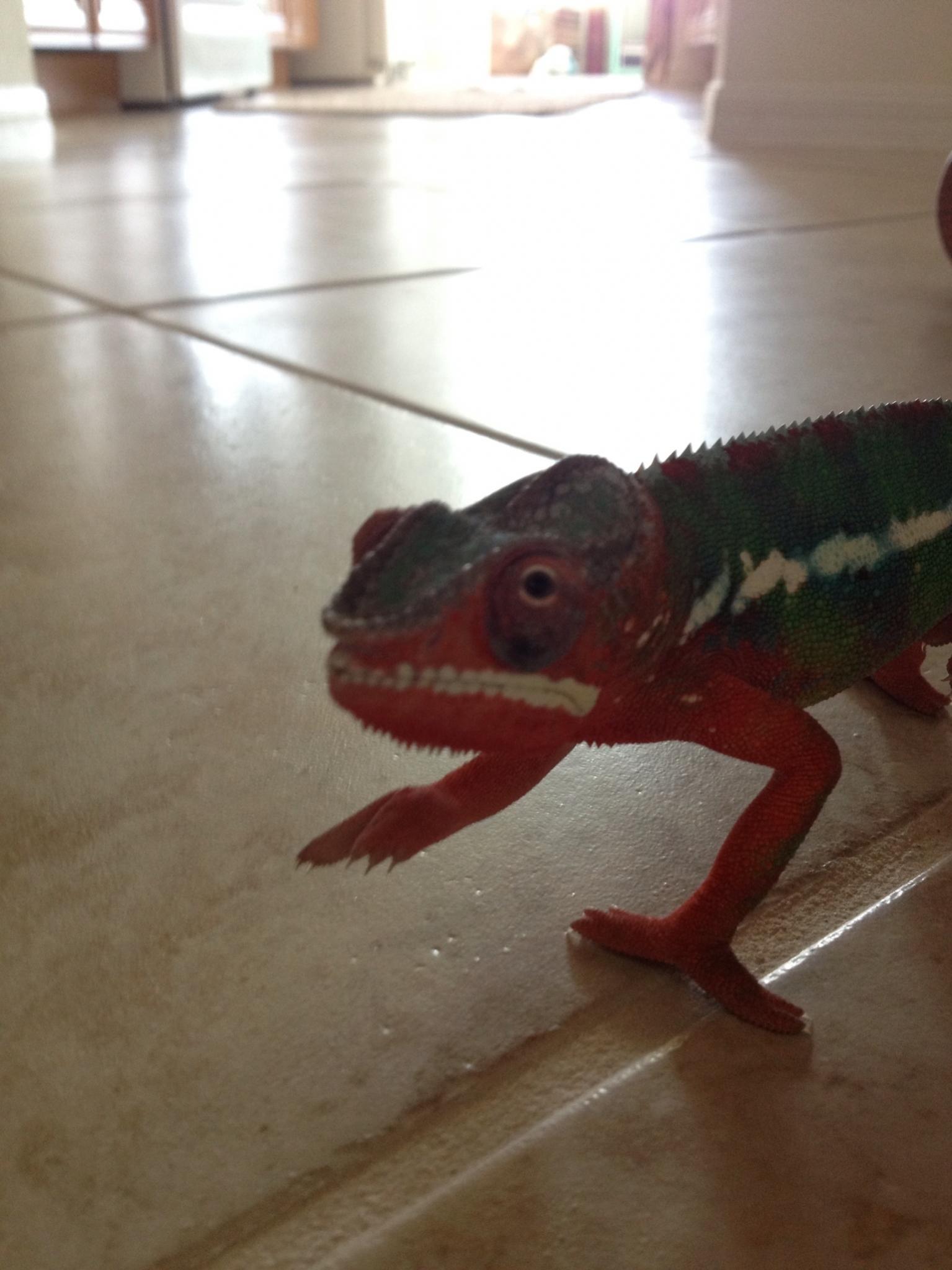 So I fed my cham a nice sized hornworm today and after he shot it and brought it back to his mouth he started thrashing around and freaked out. He completely swallowed the worm then stuck his head up in the air, to help with digesting I'm assuming. Now, about an hour later it looks like my cham has a black eye. Instead of his terret being red the lower half looks grey and sunken in a little.