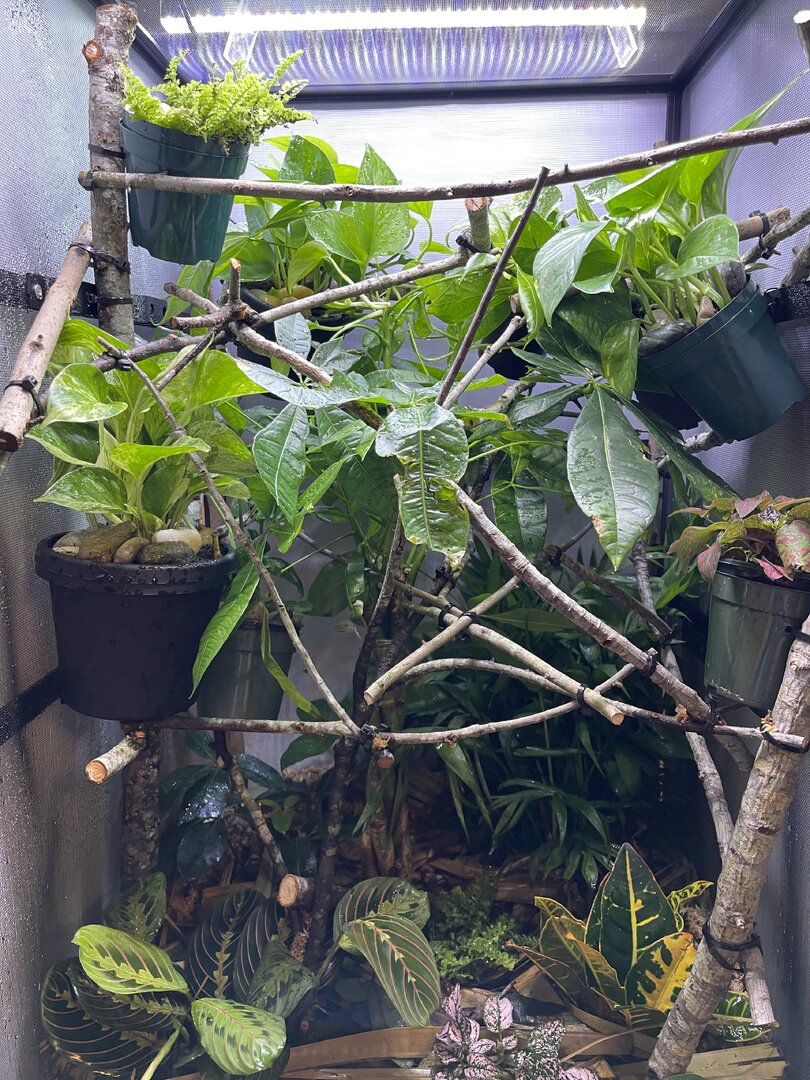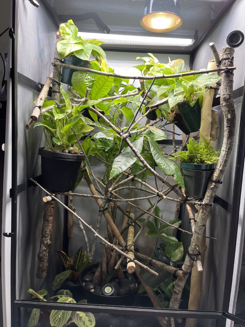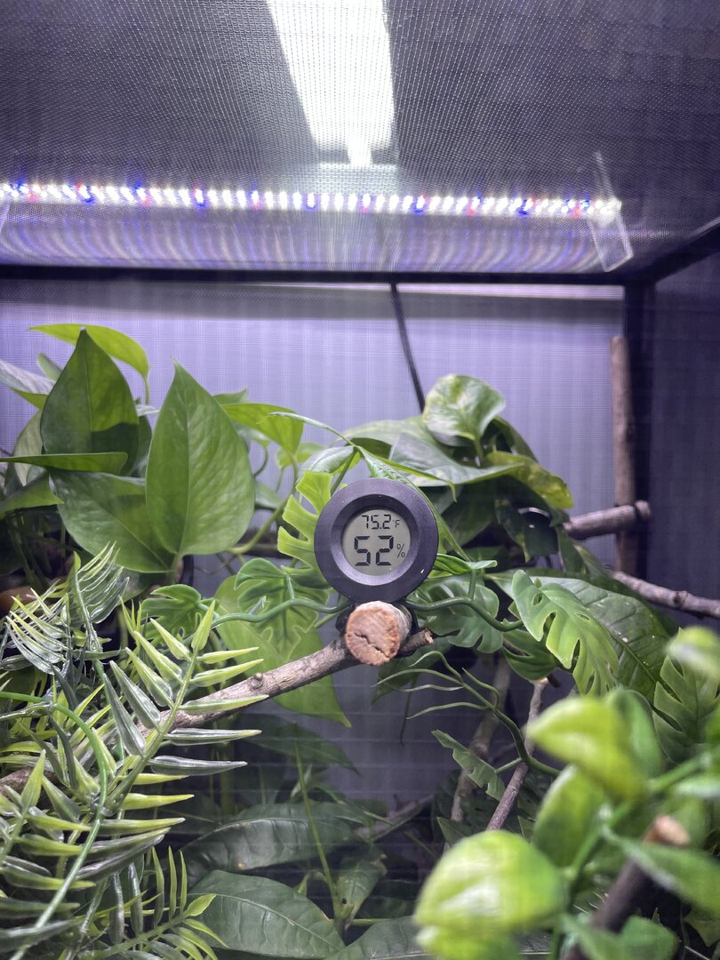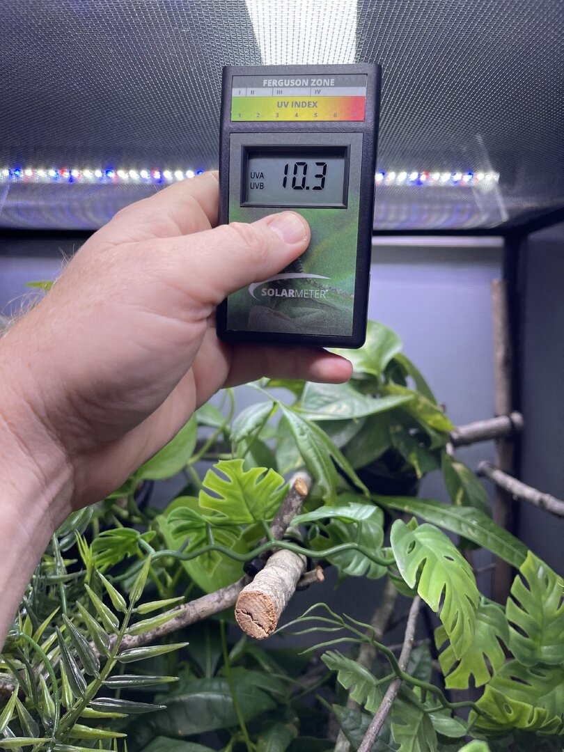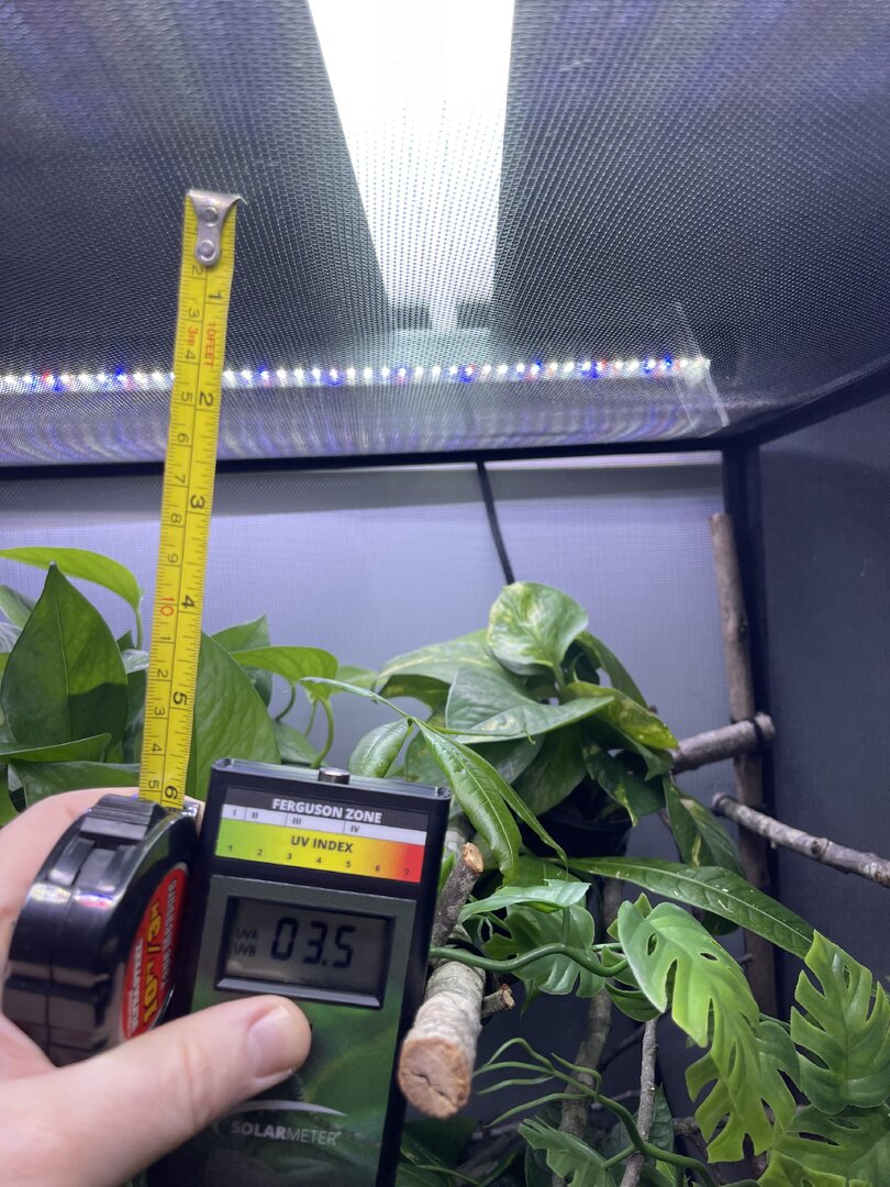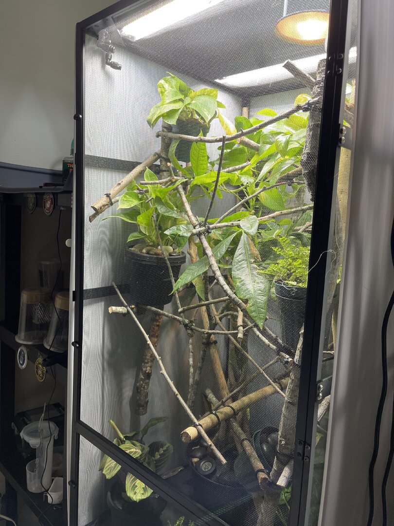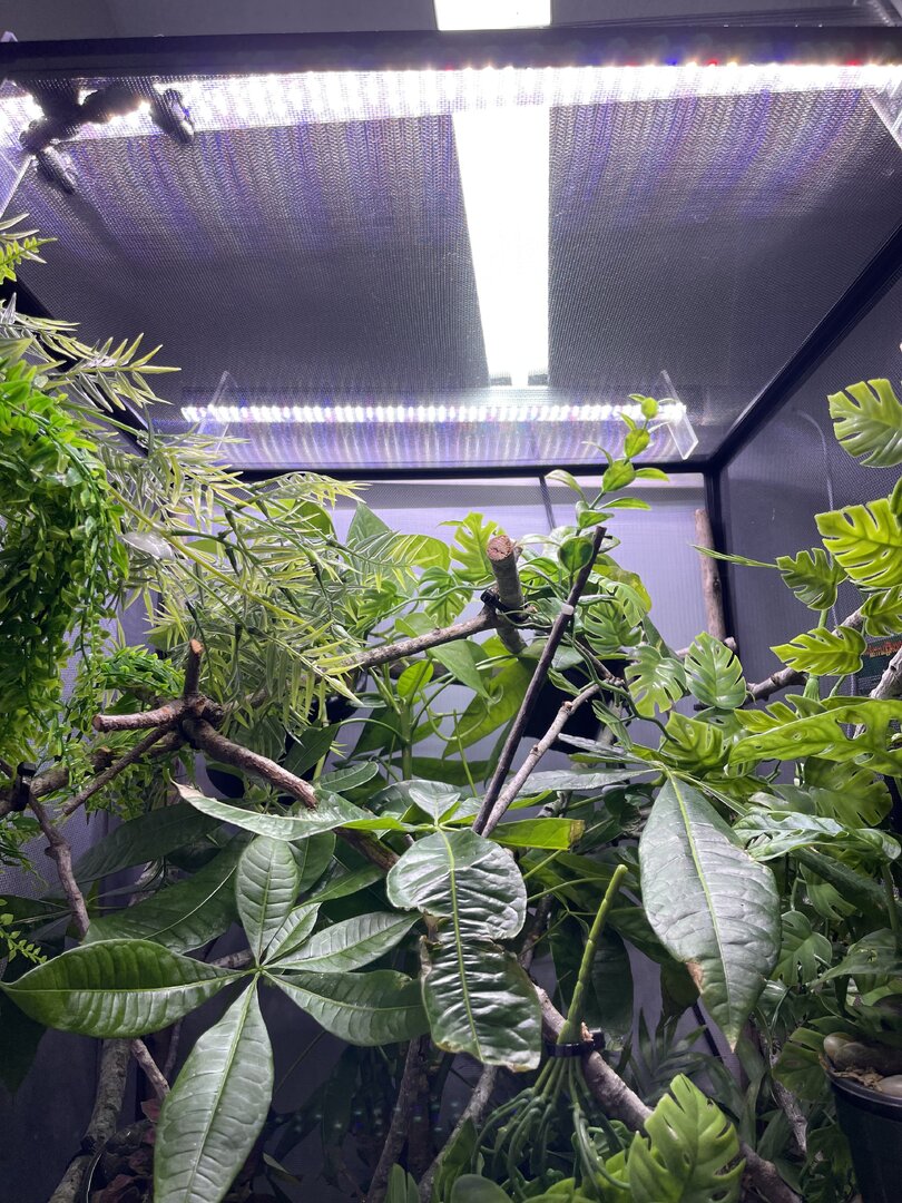 Alright here we go, new panther chameleon people here. Please do your best to be nice anything we have done wrong has not been done with malice and we are working to do the right thing. We have a male panther we got from a good breeder that was hatched Jan 3. At present he is in an 18 18 36 cage. We have been in the process of assembling his new forever home it is the typical reptibreeze xl 24 24 48. Thanks to our friends over at the you tubes we set up the floor of the enclosure as bio active with supplies from the bio dude panther chameleon package. Soil has been cycling about two weeks. Didn’t know this was more of an advanced technique (I used to keep saltwater reef tanks with live filtration etc to the algorithm may have had me dialed in above my knowledge level) any how it is what it is. We are installing dragon ledges for stability And reworking a few things. Adding Coroplast walls to control mist. Just want to make sure we are tracking along correctly. So here is what I have so far. Enclosure is on a table from ikea top branches are above my head. I am 5’11. The uvb lighting is a bit challenging as the gradient at cage top is 10 but at basking stick it is 3 3.2 Acadia light and fixture. Fixture is elevated resting on the grow lights. See attached photos. Adding a mist king and fogger that will go off a couple times a night to maintain humidity level. I have two bio dude 22 inch grow lights. Front and back of cage. Basking light is standard shield with incandescent bulb 60 watt. Temp at basking branch is appx 83 degrees see photo. Humidity at soil appx 85 percent and 68 degrees. At cage top 50% humidity and 75 degrees. We live In Houston Texas cage is being kept in my teenage sons room. Placed against far wall.