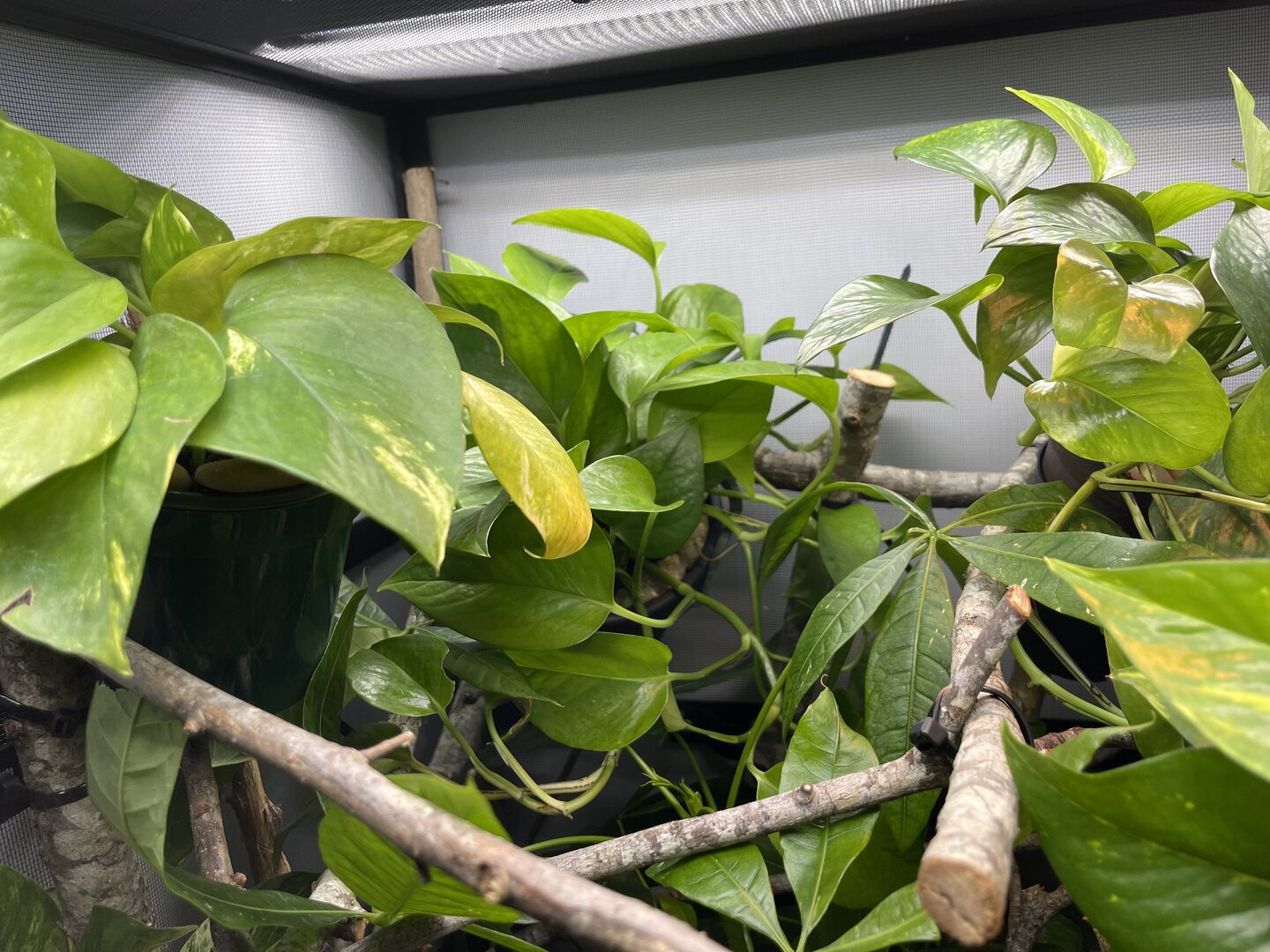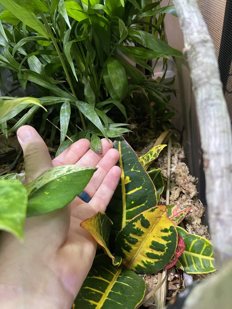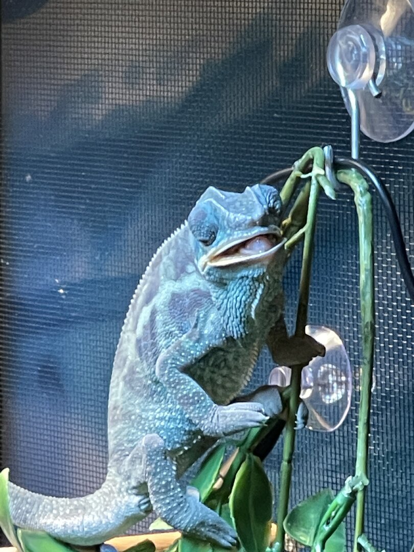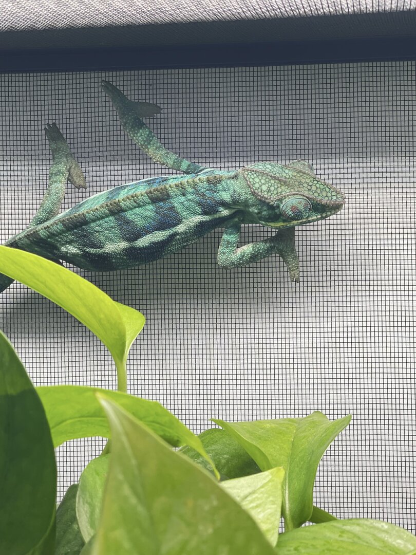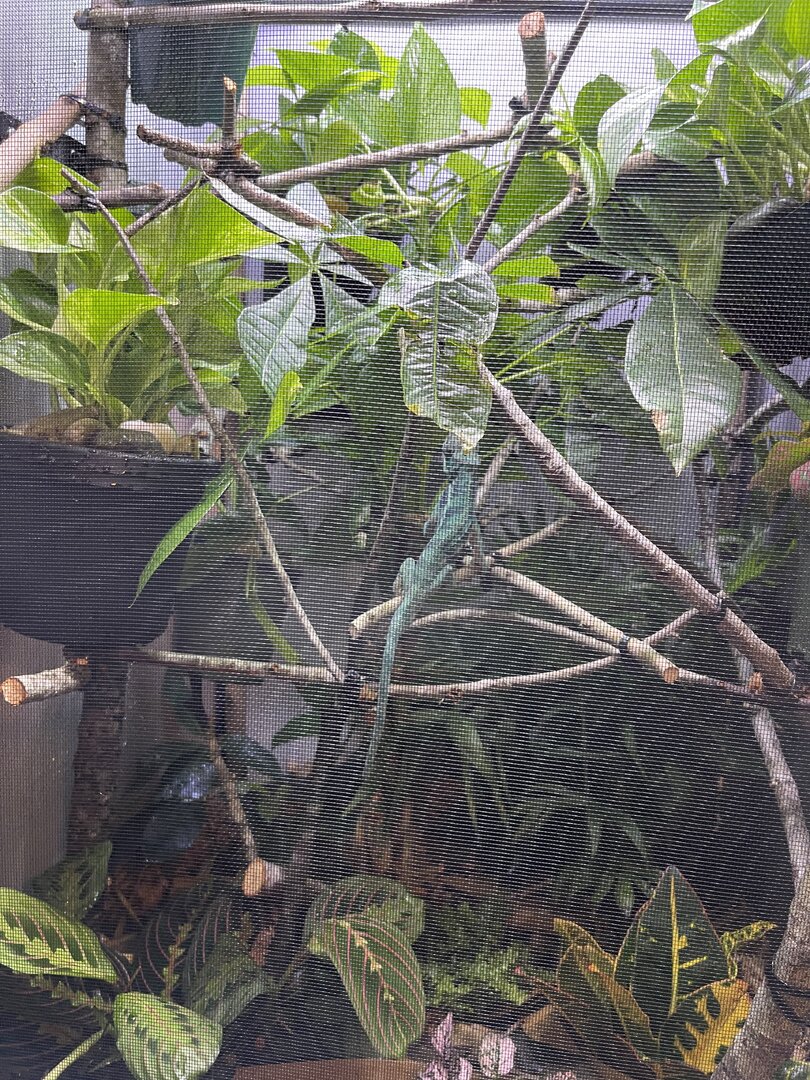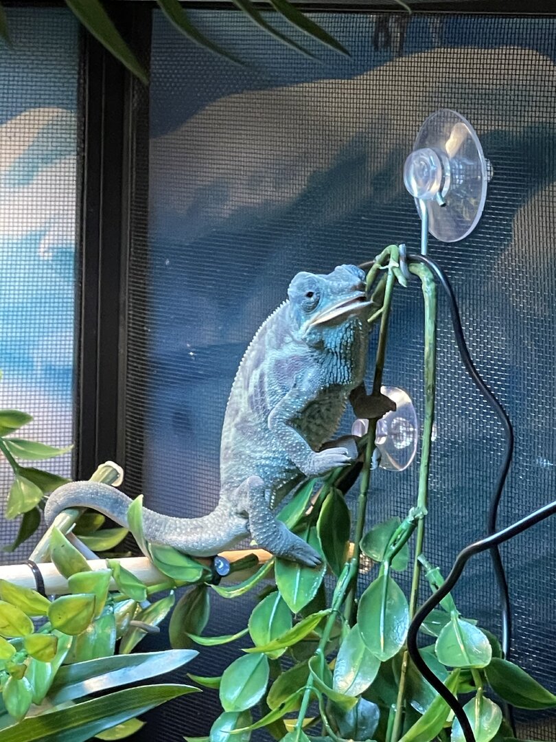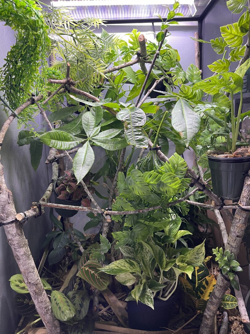 Alright here we go, new panther chameleon people here. Please do your best to be nice anything we have done wrong has not been done with malice and we are working to do the right thing. We have a male panther we got from a good breeder that was hatched Jan 3. At present he is in an 18 18 36 cage. We have been in the process of assembling his new forever home it is the typical reptibreeze xl 24 24 48. Thanks to our friends over at the you tubes we set up the floor of the enclosure as bio active with supplies from the bio dude panther chameleon package. Soil has been cycling about two weeks. Didn’t know this was more of an advanced technique (I used to keep saltwater reef tanks with live filtration etc to the algorithm may have had me dialed in above my knowledge level) any how it is what it is. We are installing dragon ledges for stability And reworking a few things. Adding Coroplast walls to control mist. Just want to make sure we are tracking along correctly. So here is what I have so far. Enclosure is on a table from ikea top branches are above my head. I am 5’11. The uvb lighting is a bit challenging as the gradient at cage top is 10 but at basking stick it is 3 3.2 Acadia light and fixture. Fixture is elevated resting on the grow lights. See attached photos. Adding a mist king and fogger that will go off a couple times a night to maintain humidity level. I have two bio dude 22 inch grow lights. Front and back of cage. Basking light is standard shield with incandescent bulb 60 watt. Temp at basking branch is appx 83 degrees see photo. Humidity at soil appx 85 percent and 68 degrees. At cage top 50% humidity and 75 degrees. We live In Houston Texas cage is being kept in my teenage sons room. Placed against far wall.