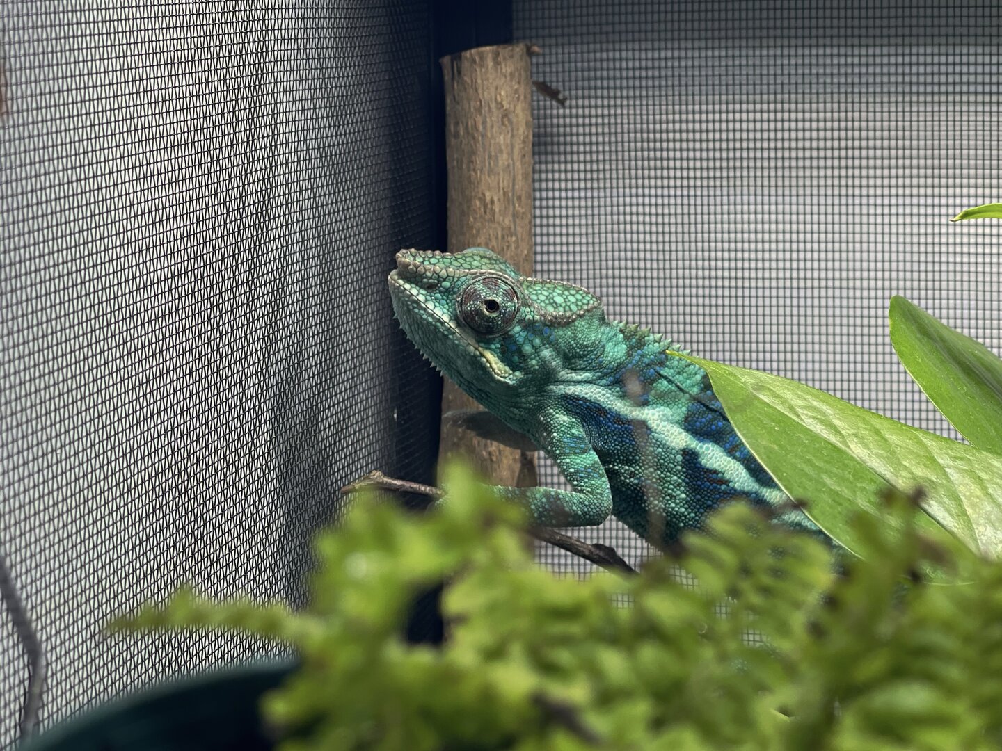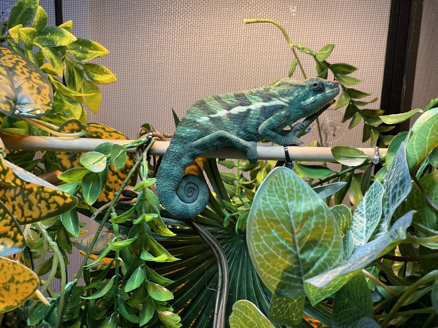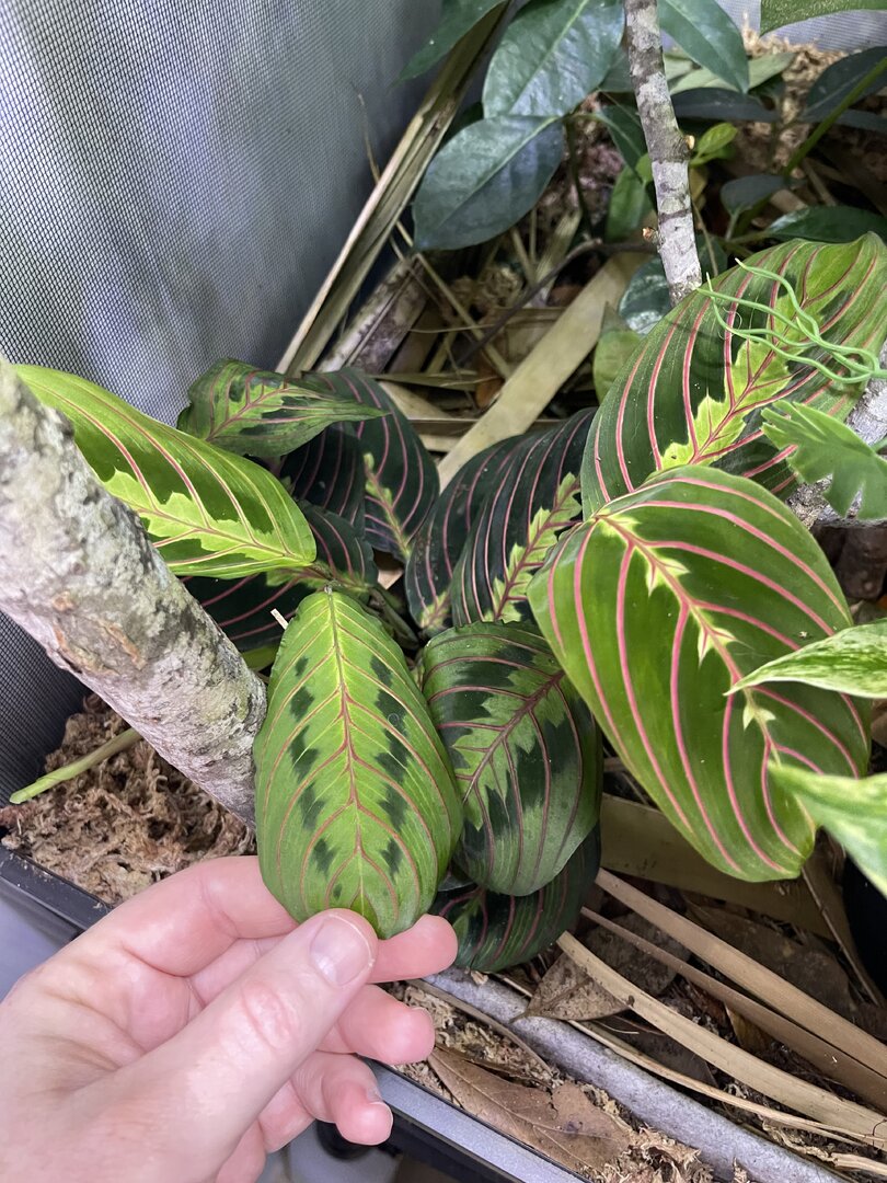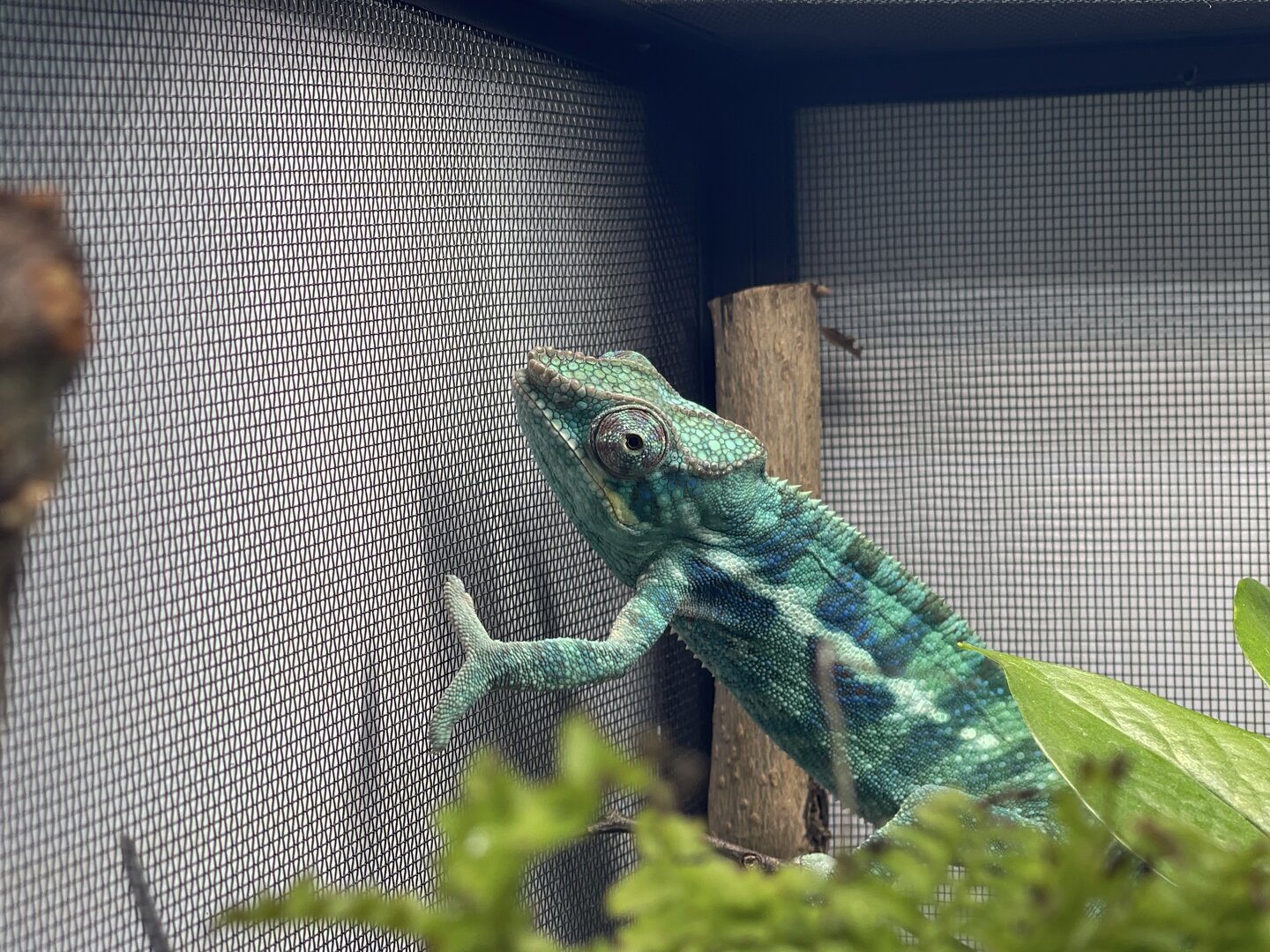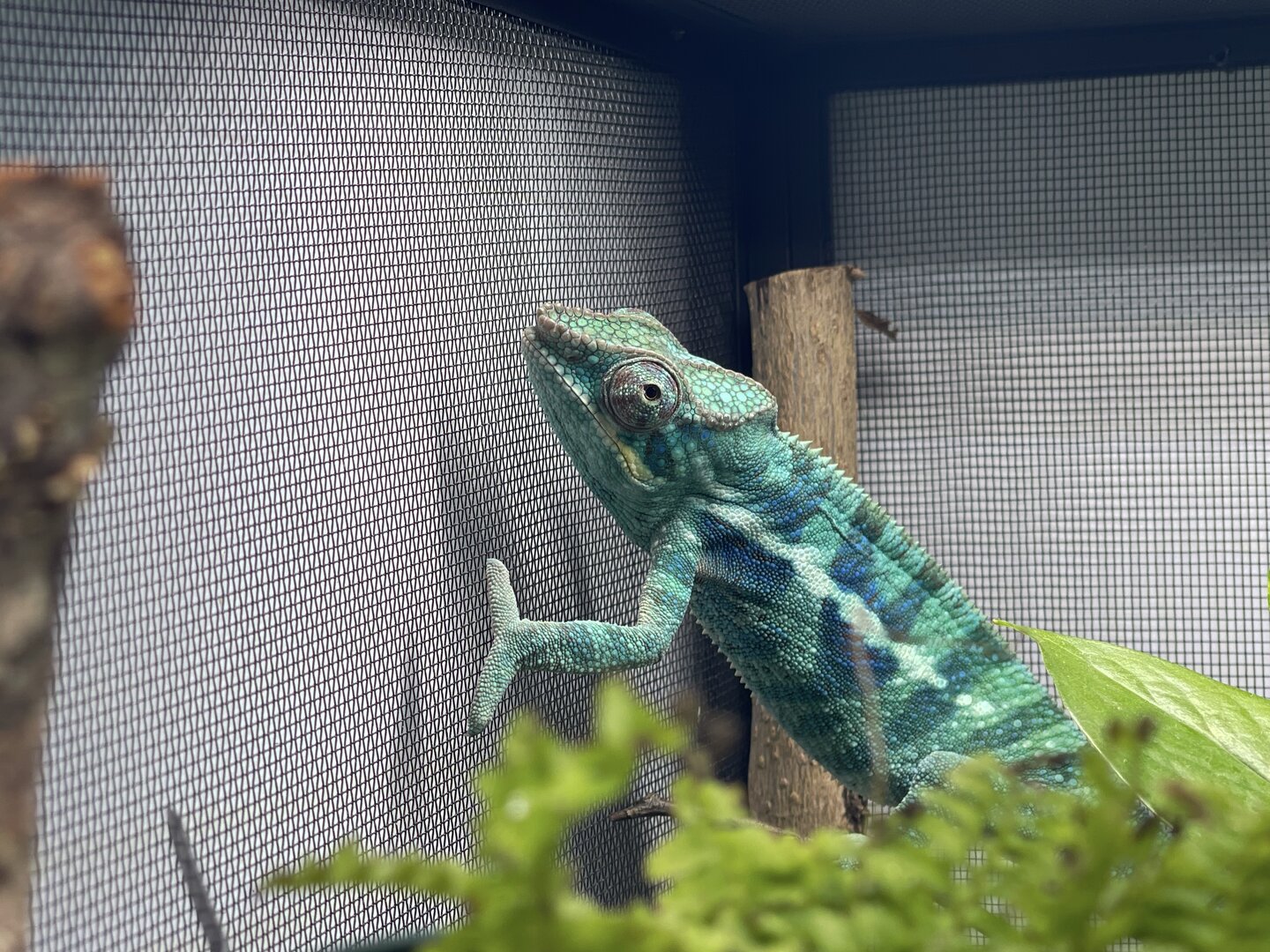 Alright here we go, new panther chameleon people here. Please do your best to be nice anything we have done wrong has not been done with malice and we are working to do the right thing. We have a male panther we got from a good breeder that was hatched Jan 3. At present he is in an 18 18 36 cage. We have been in the process of assembling his new forever home it is the typical reptibreeze xl 24 24 48. Thanks to our friends over at the you tubes we set up the floor of the enclosure as bio active with supplies from the bio dude panther chameleon package. Soil has been cycling about two weeks. Didn’t know this was more of an advanced technique (I used to keep saltwater reef tanks with live filtration etc to the algorithm may have had me dialed in above my knowledge level) any how it is what it is. We are installing dragon ledges for stability And reworking a few things. Adding Coroplast walls to control mist. Just want to make sure we are tracking along correctly. So here is what I have so far. Enclosure is on a table from ikea top branches are above my head. I am 5’11. The uvb lighting is a bit challenging as the gradient at cage top is 10 but at basking stick it is 3 3.2 Acadia light and fixture. Fixture is elevated resting on the grow lights. See attached photos. Adding a mist king and fogger that will go off a couple times a night to maintain humidity level. I have two bio dude 22 inch grow lights. Front and back of cage. Basking light is standard shield with incandescent bulb 60 watt. Temp at basking branch is appx 83 degrees see photo. Humidity at soil appx 85 percent and 68 degrees. At cage top 50% humidity and 75 degrees. We live In Houston Texas cage is being kept in my teenage sons room. Placed against far wall.