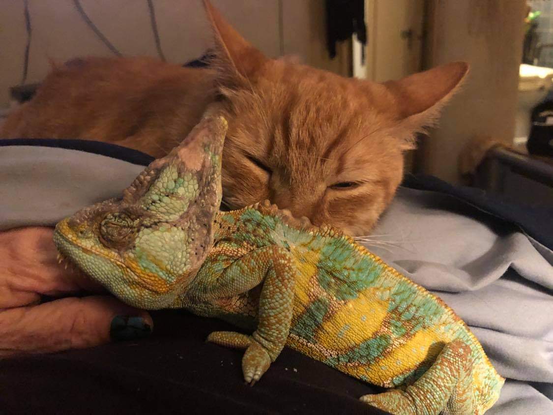 All it takes is just one second for a cat to grab a cham... And your left with piercing holes in a chameleon. While I understand you feel this is ok with your animals I would caution against recommending it or showing pictures like this. It advocates that it is ok. And someone that does not understand will see this picture and will think it is perfectly normal and safe.