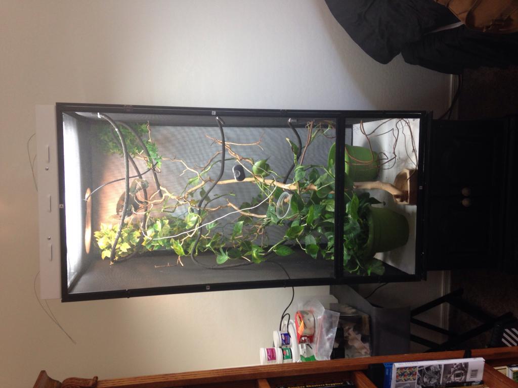 Lighting - 45 watt heat lamp had a 75watt but he was gapping UVB is a T5 zoomed 5.0uvb 2 feet long directly onscreen top cage. Also have 3 t5 bulbs in the same fixture with the UVB bulb they are daylight bulbs. Light schedual is 7:30am to 7:30 pm sometimes he is up before and asleep before the lights go on or off about an hour