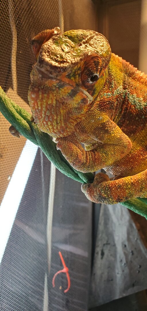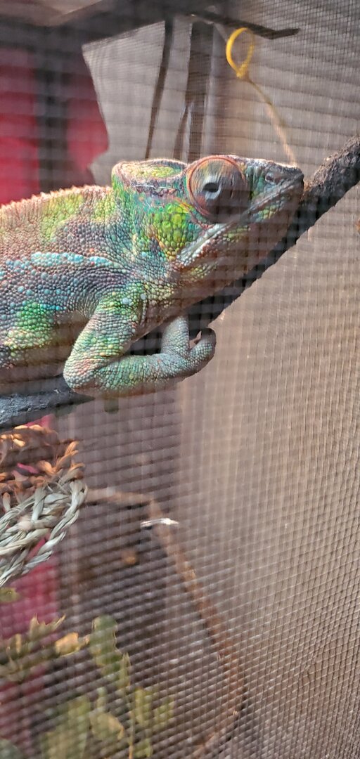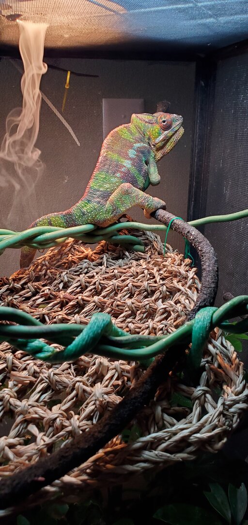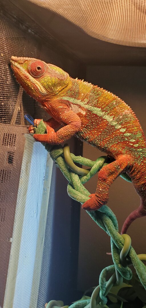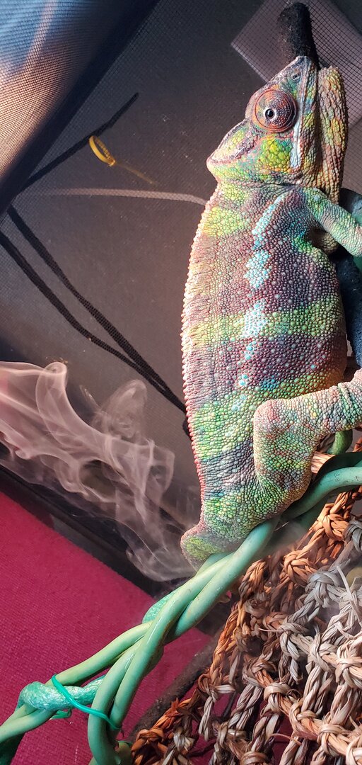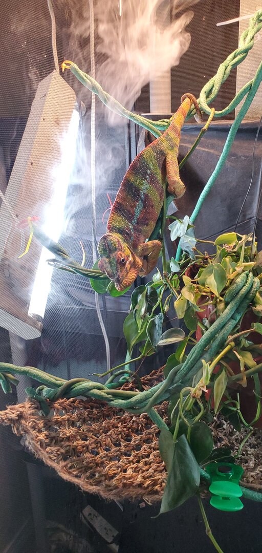 My name is Tracey. I have been reading this page for years and some of you guys have been here really long time. So my boys are almost 7. They are panthers. Their lights have been changed every 8 months for years. Their plants are live and their basking lights are different because 1 likes 85 or so and the other would rather it be 79 or 80. He is the larger of the 2. He has grown grouchy and tries to bite me if I move stuff around in his cage They wake up and go to bed at sunrise and sunset respectively. Their humidifier runs w the lights on a timer. Cage gets dry at night. Pump out water from the bottom every night. Water gets a little bleach every few weeks. Everything is ok for years but now,, except the large one (Houdini) falls sometimes. He is a little fat now. So I put a barrier up to catch him. He has also taken to climbing down from his usual spot and sleeping in his big plant. The other one (Drago) sleeps all night too but hangs his hands off the perch about halfway thru the night.