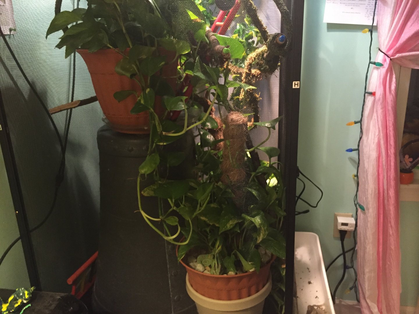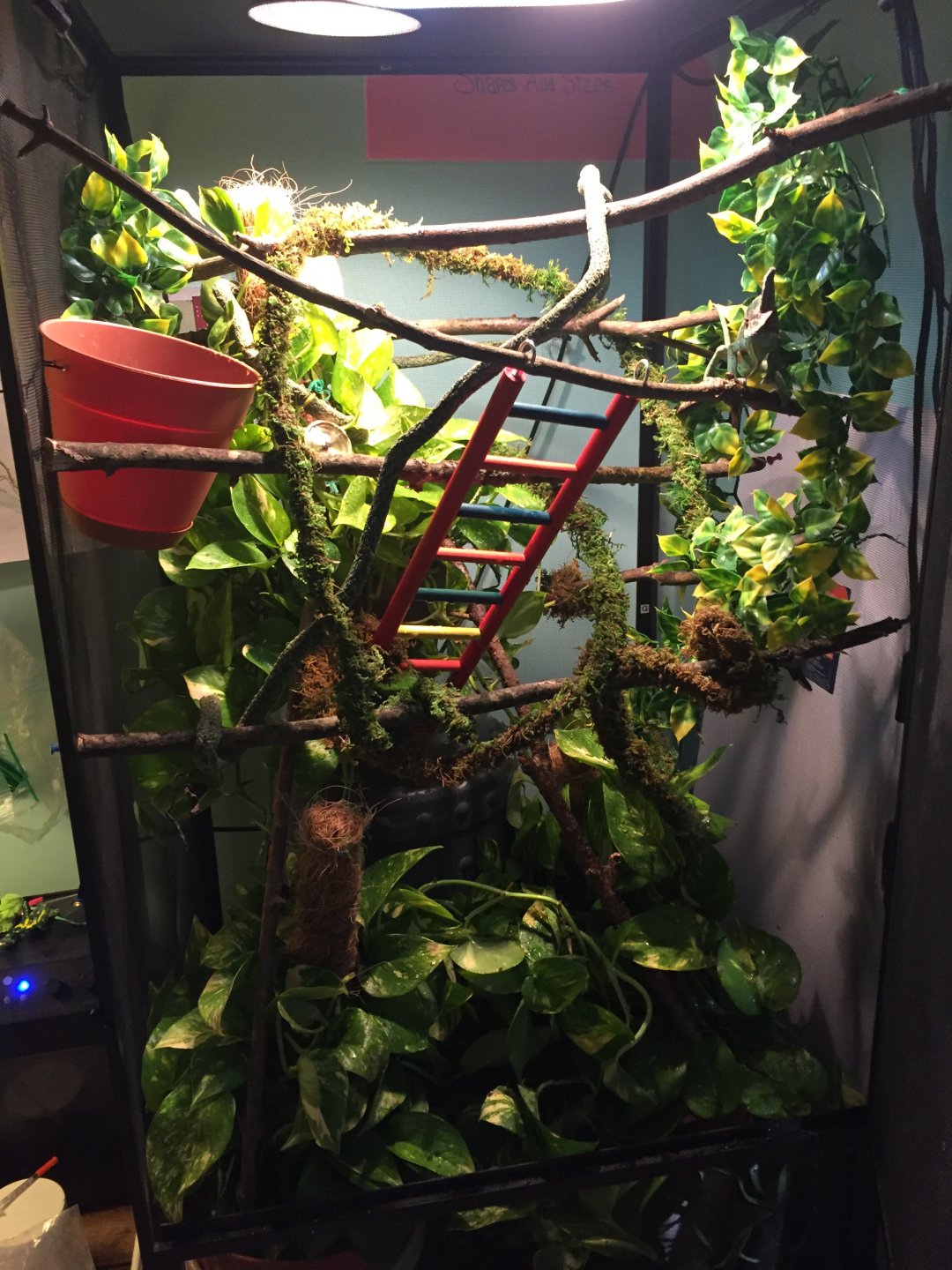 - Plants - yes I use live plants. I have 3 big golden Pothos in there that he will on occasion munch on. I also have fake leave hanging on the side to catch some water and fake vines. I also have real sticks I collected form outside and him to climb on. I also have bird ladders in his cage to climb on lol