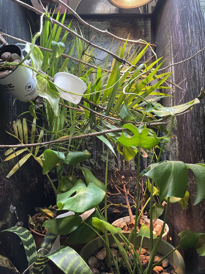 I feed him the extra small Dubia roaches, medium BSLF and I believe the small superworms (that he rarely eats). I had been cup feeding him, which he was doing fine with. He eventually stopped eating from the cup, but he will eat if I release them into the enclosure. I had spoken to someone in a Facebook group about this, and was told to stop doing that so that he will get back into cup feeding again. I didn’t do that, because I didn’t want him to starve. I haven’t seen any dead bugs/chewed bugs in the enclosure. Unless they had all somehow ended up buried in the plant soil or underneath the rocks. I want to change to a feeder run as advised previously, then I can monitor that easily.