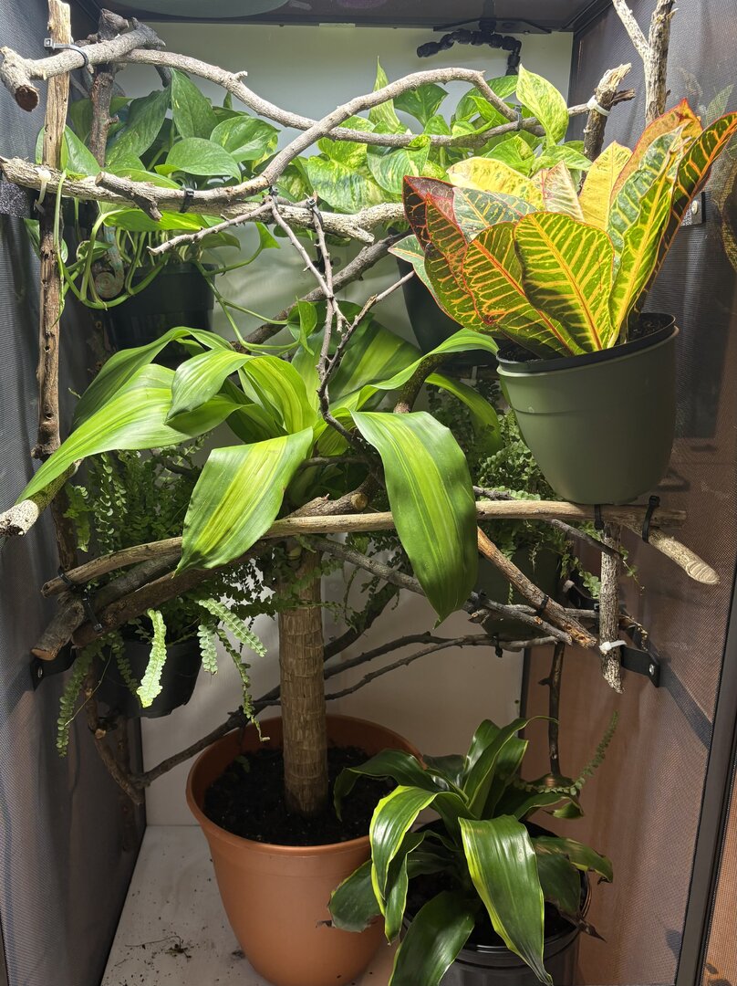 Gingero Neptune the Chameleon Site Sponsor Jul 7, 2025 #4 Love the plants you have! I would add one more on the bottom left side as well as some more thin branches at the bottom so he can explore down there